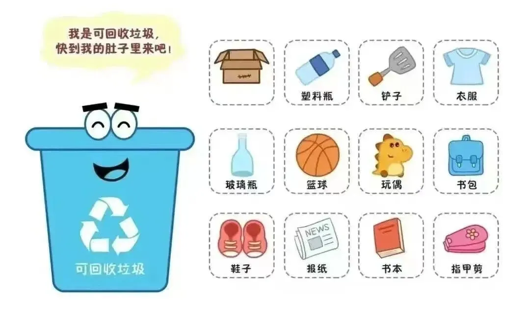 可回收物主要包括废纸、塑料、玻璃、金属和布料五大类。