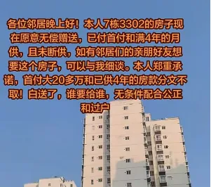 其实这种也不少见了,很多都是还不上贷款了,卖的话费时间还不一定卖的出去,不卖又不行,而且还有一种可能,是卖了都还不够还银行的钱,有人说但凡卖的钱够还贷款他都不会白送,都是倒挂,说白送很多腰斩的那种。