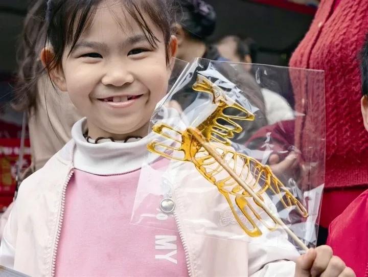 南湖公园迎春市集,小朋友开心展示糖画马。