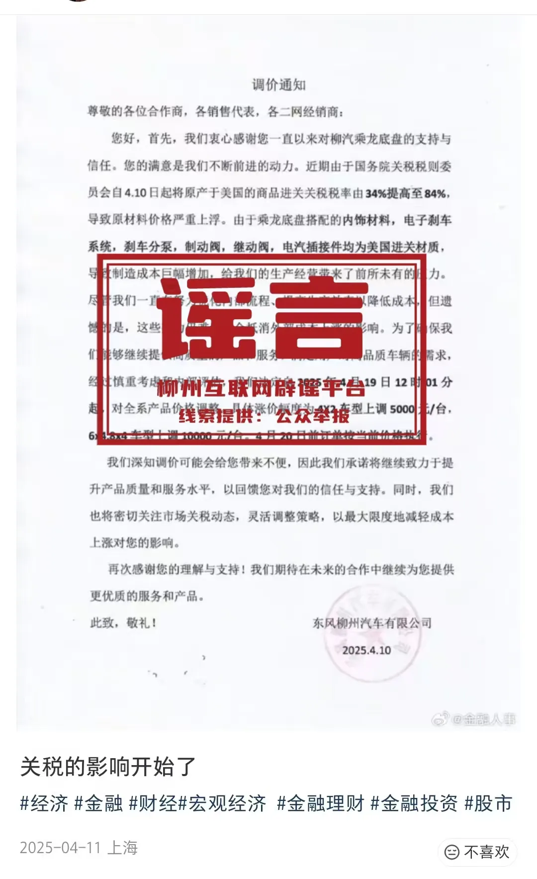 经核实,网传信息不实。东风柳州汽车有限公司从未发布任何关于“因关税调整导致产品价格上调”的通知。东风柳州汽车有限公司产品价格政策稳定透明。所有官方信息均通过公司官网、官方微信公众号及授权渠道发布。