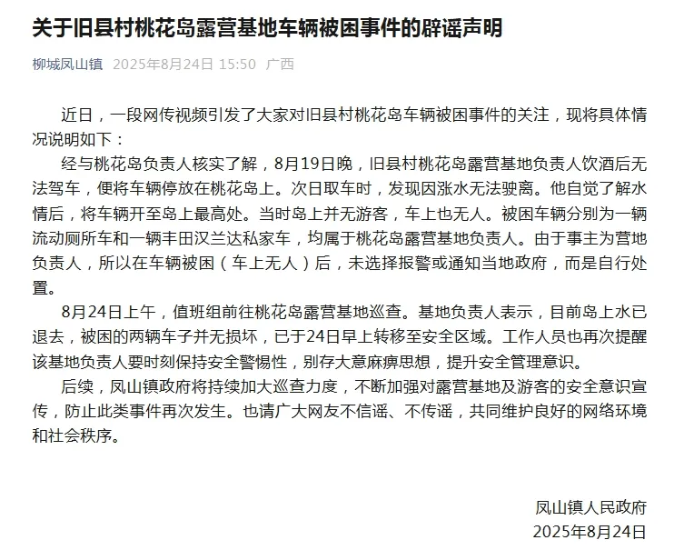经核实,网传信息不实。图片中车辆被困时人员已全部撤离,8月24日上午,桃花岛露营基地负责人表示岛上水已退去,被困车辆并无损坏,已于24日早上转移至安全区域。