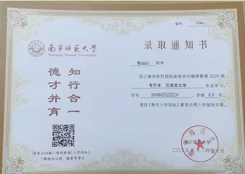 南宁师范大学成人高考2026录取通知书及入学指南