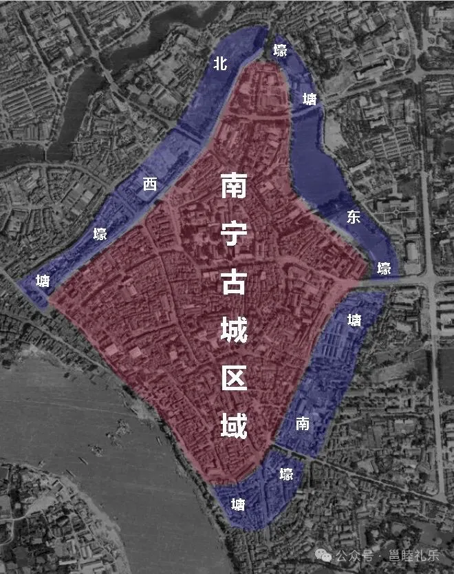 《永乐大典·南宁府志·城郭篇》记载,明初洪武年间重修的南宁城共开有五门,分别是镇边、镇江、安塞、 朝京、新东门。其中仅有“安塞”为宋代的旧名,其余尽皆新名(笔者认为镇边门的“镇边”一名,疑为“镇远”的误写,因为边、远二字相近)。在明清540余年的时间里,除去明万历三十年(1602)重开的第六门(南门)外,上述五门位置几乎不变。而这五门中,镇边、镇江、安塞为明初南宁城的临江三门,其正好对应北宋邕州城的临江三门。这说明二者的规制是一致的,明代与宋代的临江三门具有传承性。