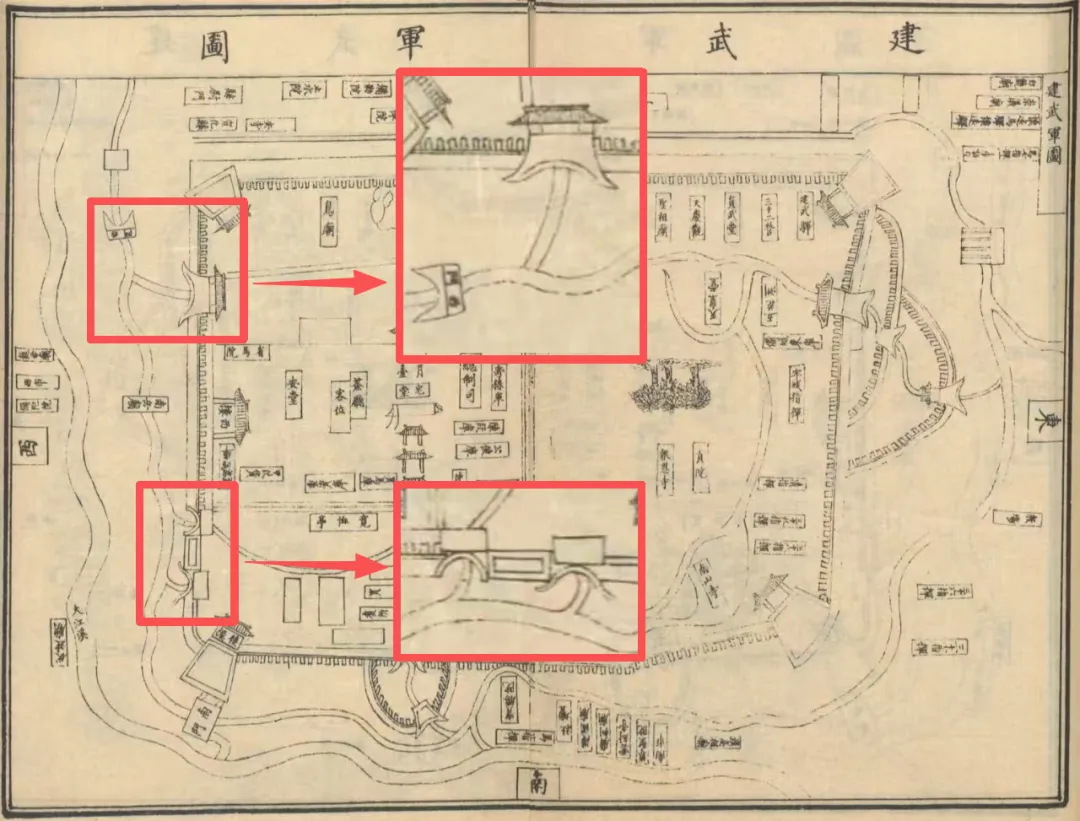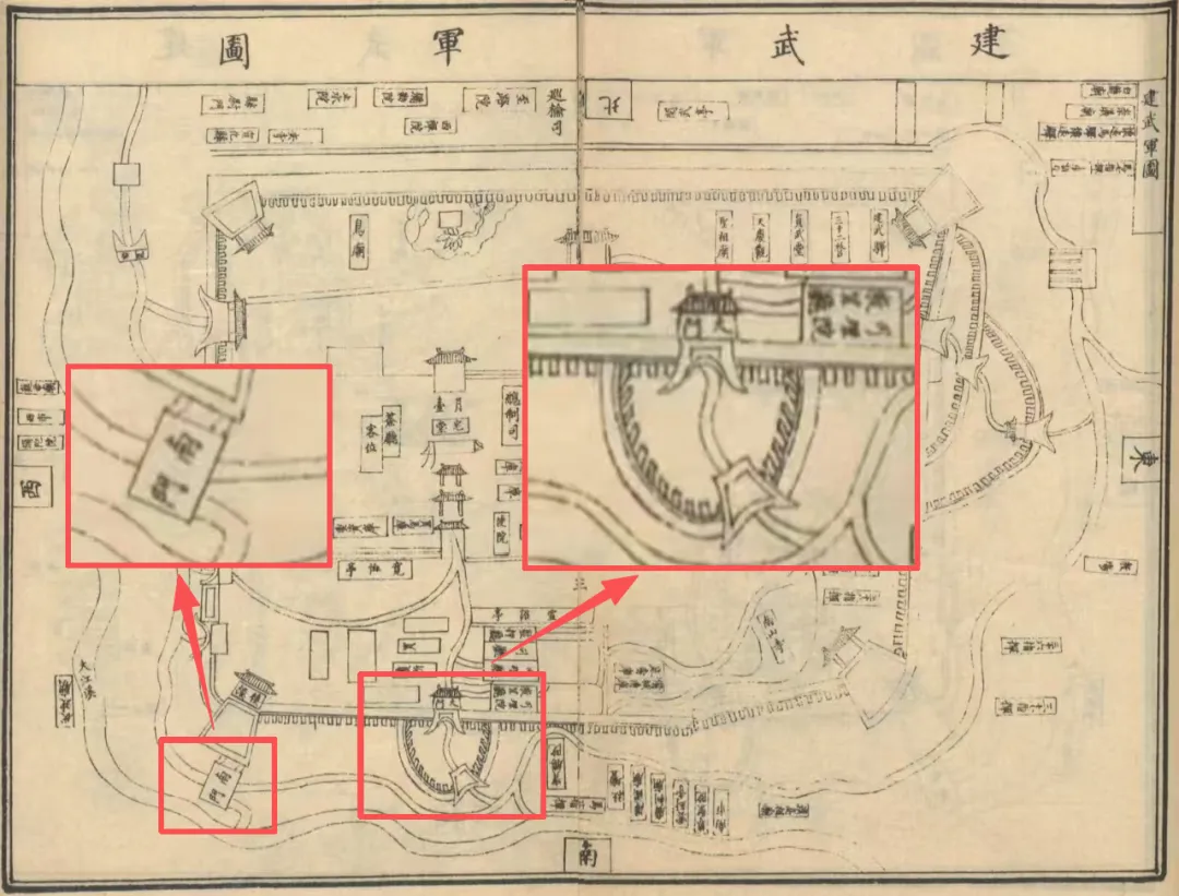 既然镇远、安塞、威济三门在西,那剩下的“长泰”便应是在南了。通过比对南宋“建武军图”,我们可以清晰看到南面城门上标注着“大门”二字,门外还修筑起了一座瓮城。瓮城外通向临江三门的道路上还标注有“南门”的字样。这凸显出了长泰门向南防御的布局,以及该城门的重要性。