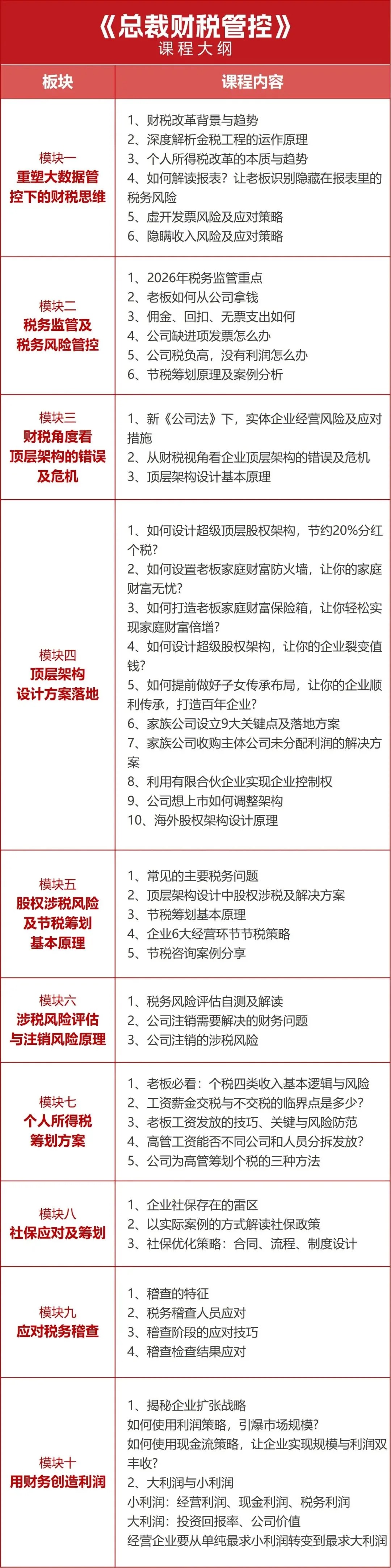 课程专门针对企业老板或股东成员,帮助老板提升财务管理能力,倍增利润、降低风险。经营中看懂财务报表,利用财务手段节税避税、控制成本,从而达到保证财富安全,盈利能力不断增长的目标。