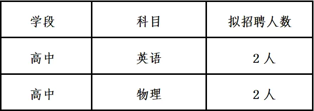 高中语文教师1名;高中英语教师2名;高中数学教师1名;高中历史教师1名;高中物理教师2名;高中生物教师1名;高中政治教师1名;高中化学教师1名。