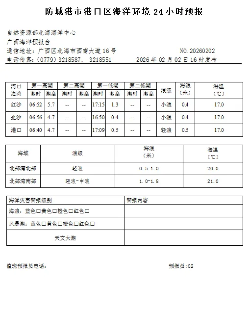>2026年2月2日防城港市港口区海洋环境24小时预报