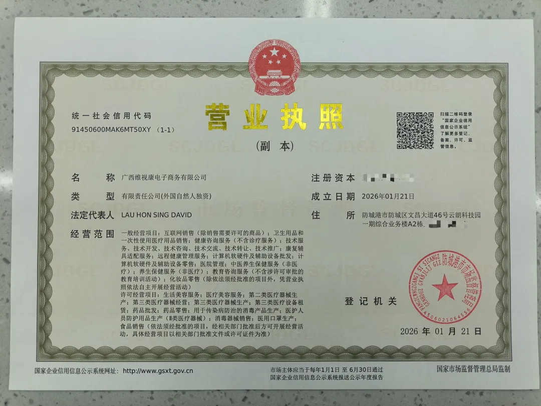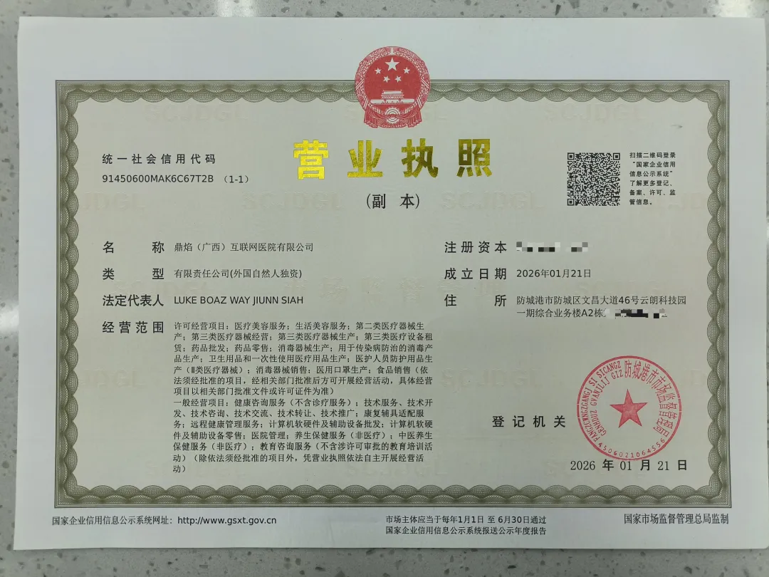 2026年1月21日,鼎焰(广西)互联网医院有限公司、广西维视康电子商务有限公司正式注册落户云朗科技园,成为防城港阿康国际互联网数字医疗产业园区首批外资独资互联网医院与二类医疗器械企业。