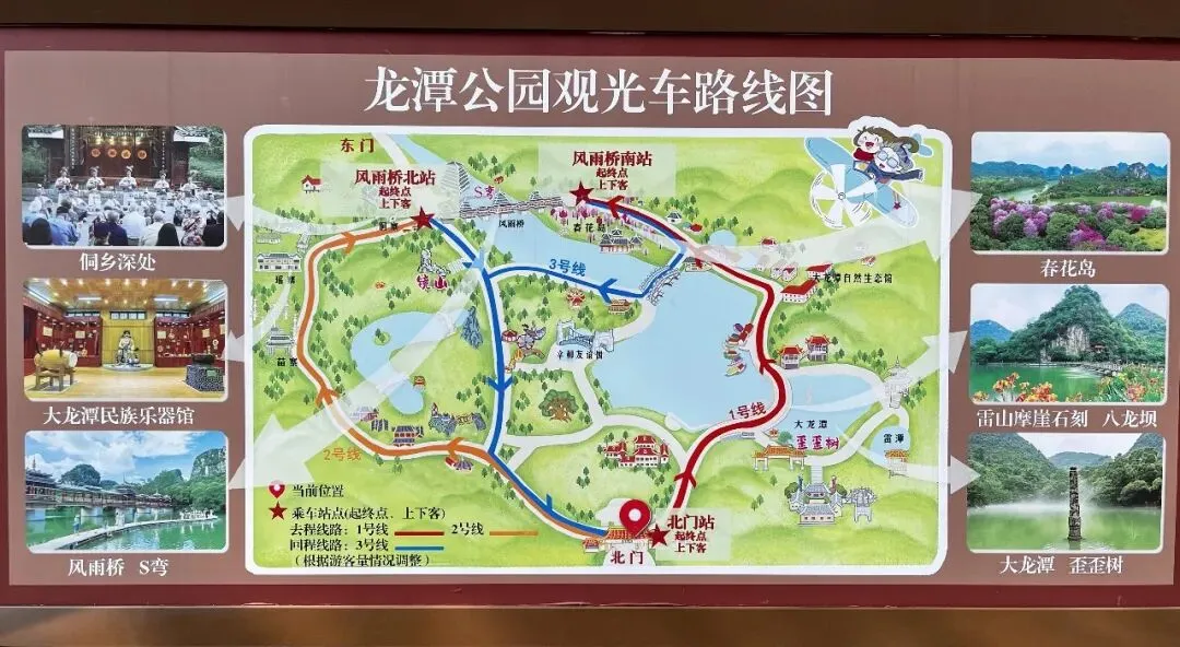 公园常年开放,免费进入。我12:15走到北门,没想到景区超级大,仔仔细细逛一遍的话,接下来的半天时间就全泡在这儿了,想着计划中还有很多打卡点,龙潭公园只能择要游览。看了导览图,定下大龙潭、歪歪树、风雨桥、S弯这些景点必游。