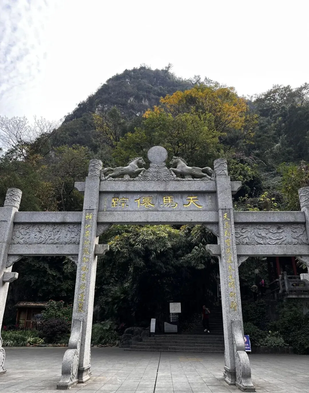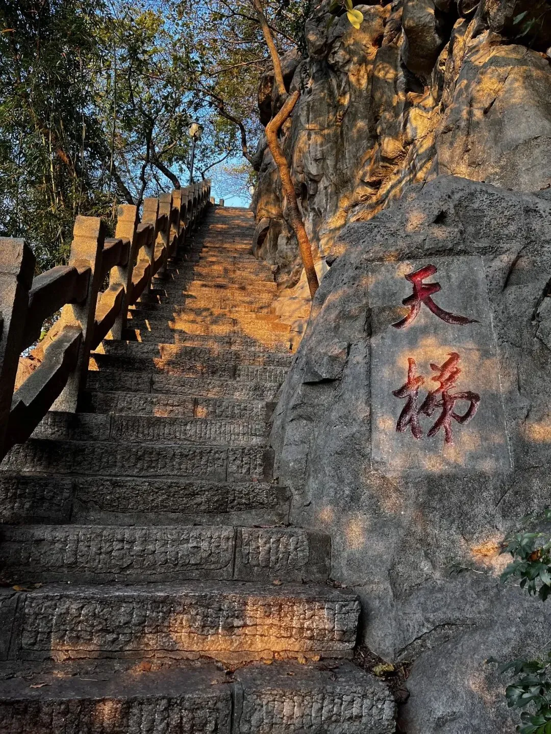 马鞍山古称仙弈山,海拔271米。马鞍山极具阳刚之美,山高陡峭,气势如虹,形似马鞍。如遇雨雾天气,半山云遮雾绕,马鞍若隐若现,宛如骏马凌空奔腾,“天马腾空”由此得名,曾为柳州古八景之一。马鞍山自唐宋以来就是柳州的游览胜地,山上有珍贵的摩崖石刻70余方。从山脚沿石径到达山顶,可观看柳州全城景色。我从天马山主山道入口,