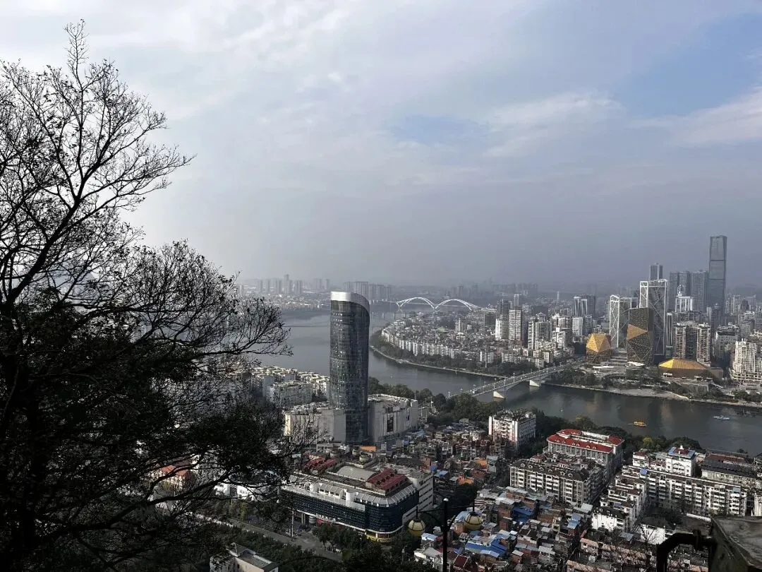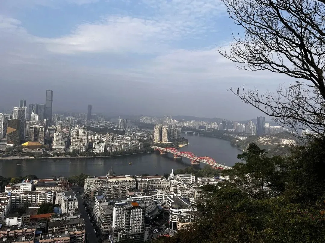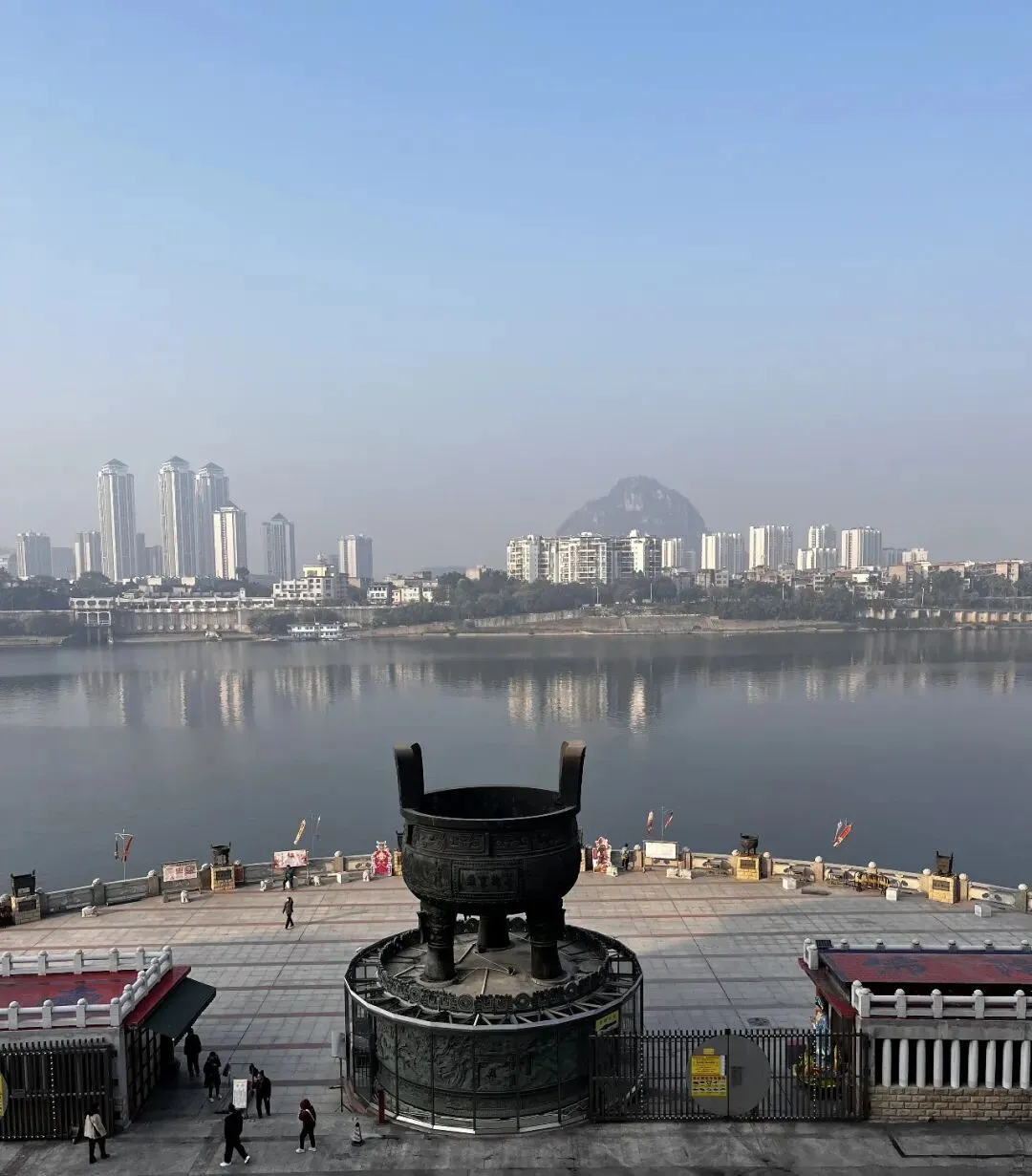 登高远眺,柳州全城尽收眼底。此时可见,柳江如同一条玉带,三面环绕这座城市,形成一个状如大壶的半岛,故此柳州又被称为“壶城”。清代学者顾祖禹在《读史方舆纪要》中这样描述:“柳州一名壶城,以三江四合,绕城如壶也。”