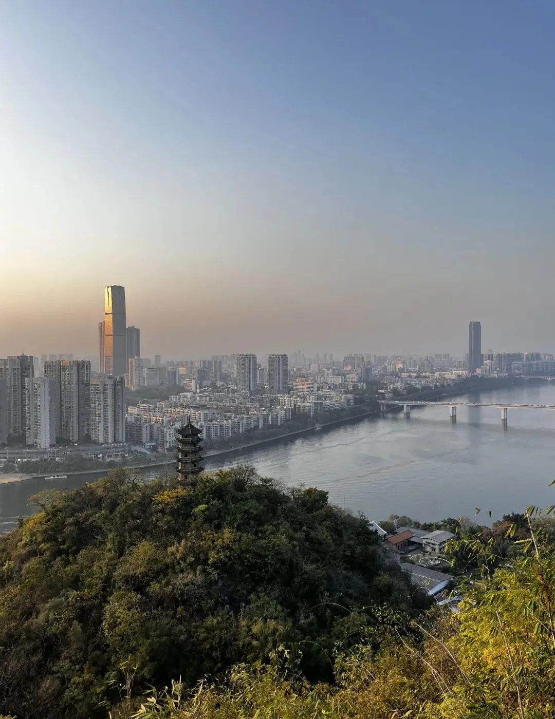 蟠龙山临江耸立,横列三峰,状如蟠龙,从古至今为柳州风景名胜。1993年蟠龙山公园破土动工,在峰顶重建文光塔、修建蟠龙塔。柳州当地有俗语:“东有宝塔西有鹅,南有马鞍北有雀”,这“东有宝塔”就是指蟠龙山上的这两座塔。两塔均为六角七层建筑,南北相望,遥相呼应,蔚为壮观。蟠龙双塔作为柳州城市地标,见证了龙城的变迁和发展。此时已快5点,两塔分列两个峰顶之上,我得抓紧上山。当时有位美女小姐姐说蟠龙塔更漂亮些,那我先去蟠龙塔。爬到塔前,只见蟠龙塔飞檐翘角、轻盈秀丽。