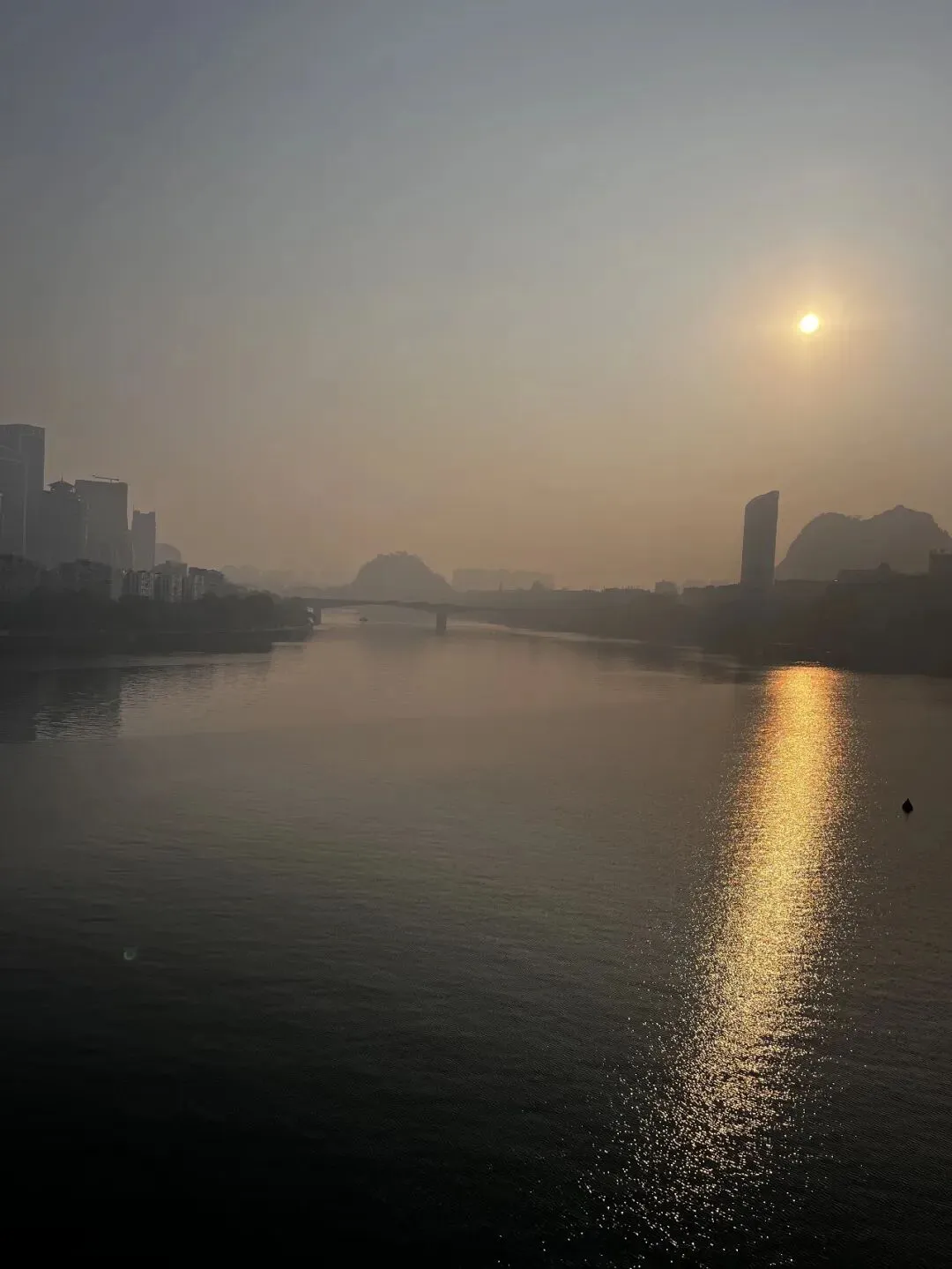 第一站西来古寺,不巧的是今天雾色较浓,但初升的朝阳还是奋力在柳江江面洒下一道金光。