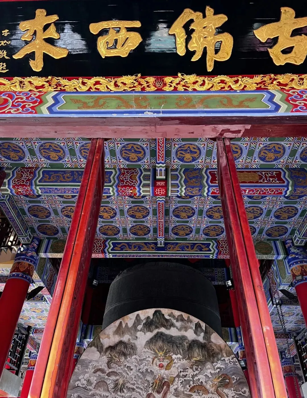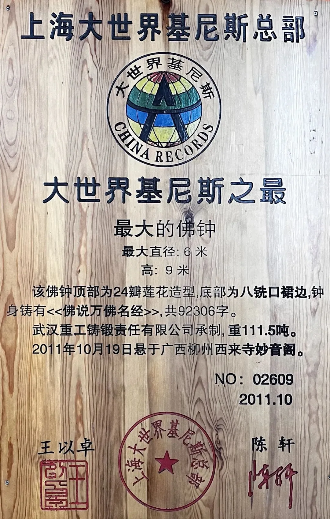 西来古寺有两项大世界基尼斯之最。其一为最大的佛钟,悬于寺内妙音阁。该佛钟最大直径为6米,高9米,重111.5吨,顶部为24瓣莲花造型,底部为八铣口裙边,钟身铸有《佛说万佛名经》,共92306字。
