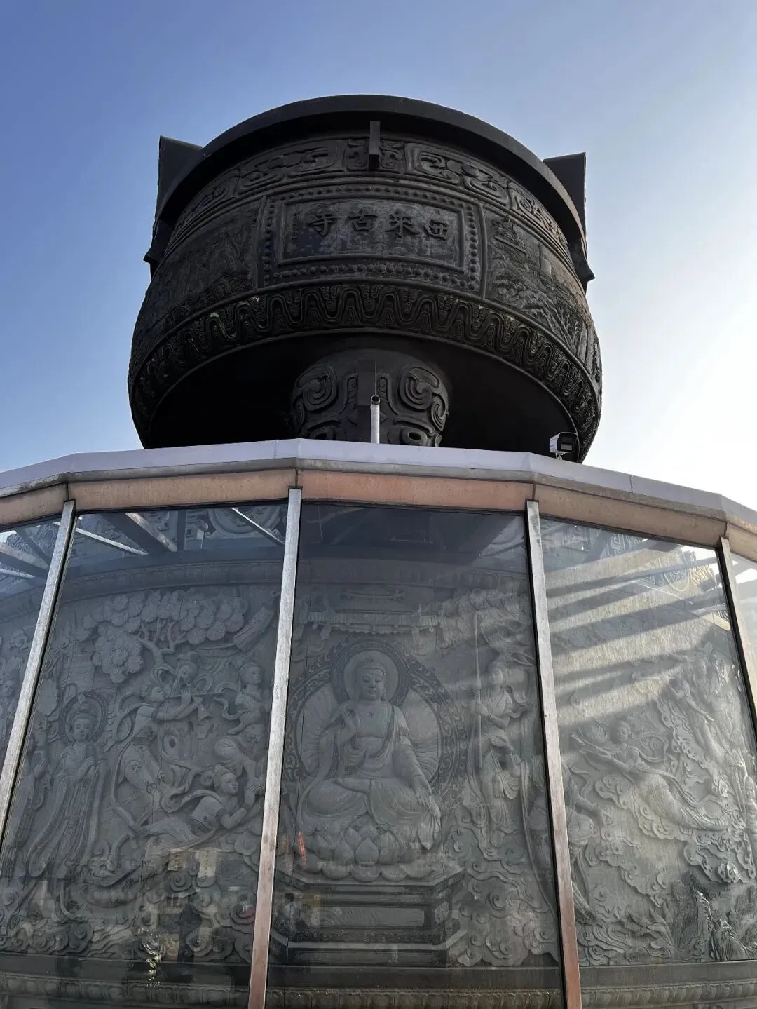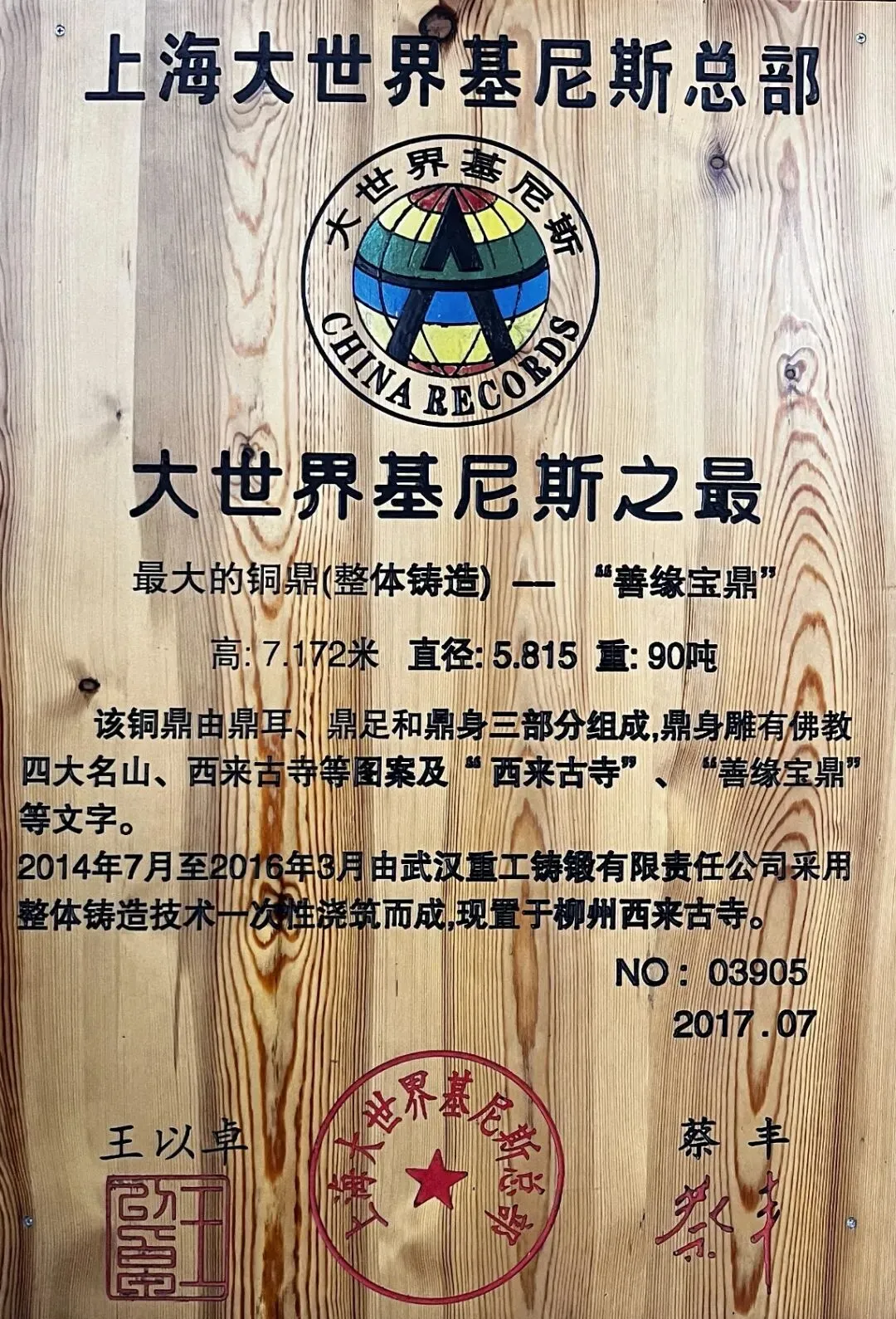 其二为最大的整体铸造铜鼎——“善缘宝鼎”。该鼎由鼎耳、鼎足、鼎身三部分组成,鼎身雕有佛教名山、西来古寺、善缘宝鼎等图案及文字。鼎高7米有余,直径近6米,重90吨,安放于西来寺前江边广场上。