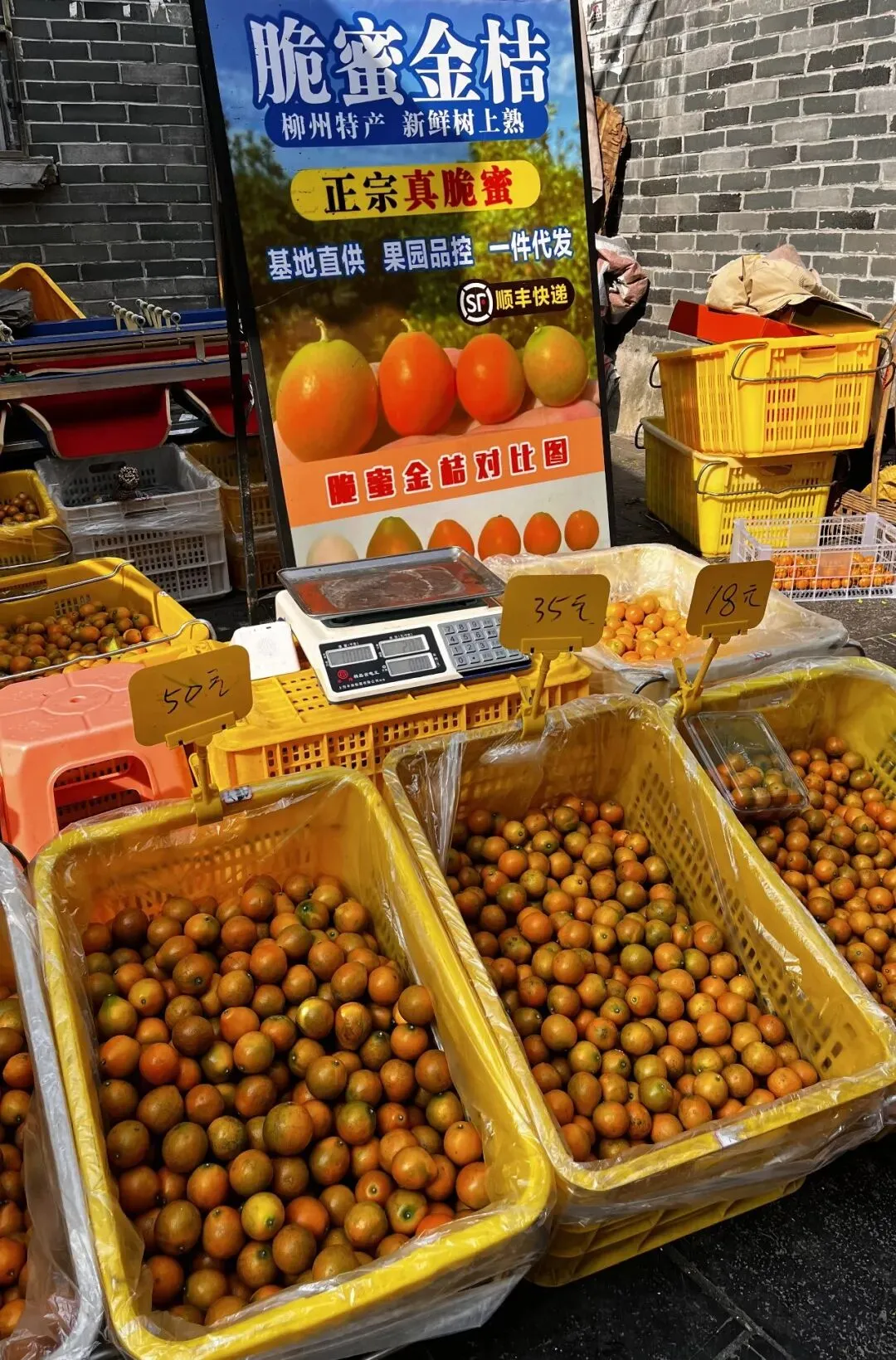都说螺蛳粉里没螺蛳,其实是没有有形的螺蛳,无形的螺蛳肯定有,即用螺蛳熬的汤底。螺蛳粉是家喻户晓的柳州小吃,以辣、爽、鲜、酸、烫为风味特点,其汤料由螺蛳、猪骨及多种原料熬制而成,配以酸笋、腐竹、花生等辅料,2018年螺蛳粉已获“国家地理标志商标”。青云市场上有众多商家零售、批发螺蛳粉,生意红火。今天在青云市场看到一种我以前从没看过、吃过的水果——融安金桔。大小不一,大的如鸡蛋,其中个头大、品相好、无裂纹的,一斤卖到50元甚至更高;个头小,品相差的,几元一斤。这个时候正是融安金桔大量上市的时候,我也试着买了一些,甜蜜可口,风味浓郁,好吃得停不下来。这种产于融安县的金桔,也是国家地理标志产品。