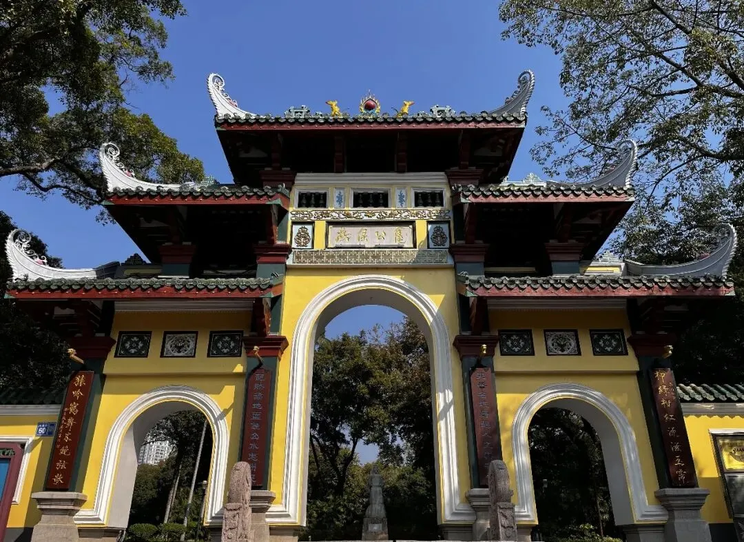 西来古寺始建年代不详,“西来”指达摩祖师自天竺西来或佛经来自西天之意。西来古寺前临柳江,遥对鹅山,上世纪八十年代重修形成现在的建筑规模。