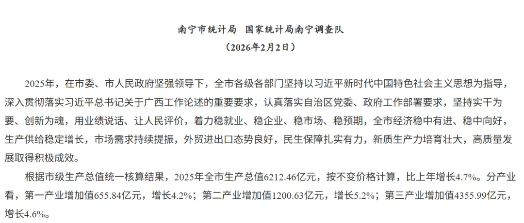 2月2日下午,南宁市统计局正式公布了2025年的南宁经济数据。2025年,南宁全市生产总值6212.46亿元,比上年增长4.7%。这是南宁首次破“6”,超过了哈尔滨(6188.5亿元),但与昆明(8637.45亿元)差距略微拉大。从产业看,第一、第二、第三产业均有超4个百分点的增加。值得肯定的是工业方面的数据,2025年全年南宁规模以上工业增加值,比上年增长了9.1%。从门类来看,增长主要依靠制造业,增加值增长10.2%。这其中,规模以上高技术制造业、装备制造业,增加值分别增长66.0%、20.3%,从行业来看,造纸和纸制品业居首,增加值增长26.3%。其次是电气机械和器材制造业,增加值增长26.3%,第三则是计算机、通信和其他电子设备制造业,增加值增长25.4%。而这三个行业,都是目前南宁市正在大力引进的产业,且多集中于东部新城。▲图源赵翔摄