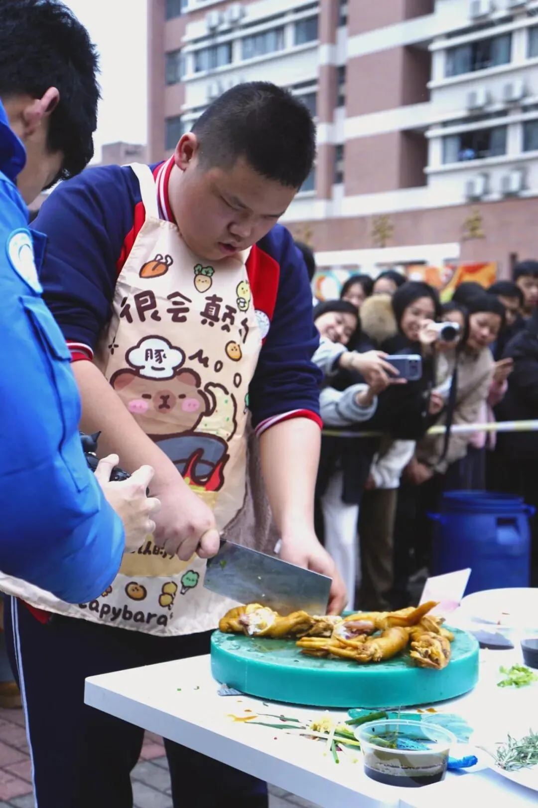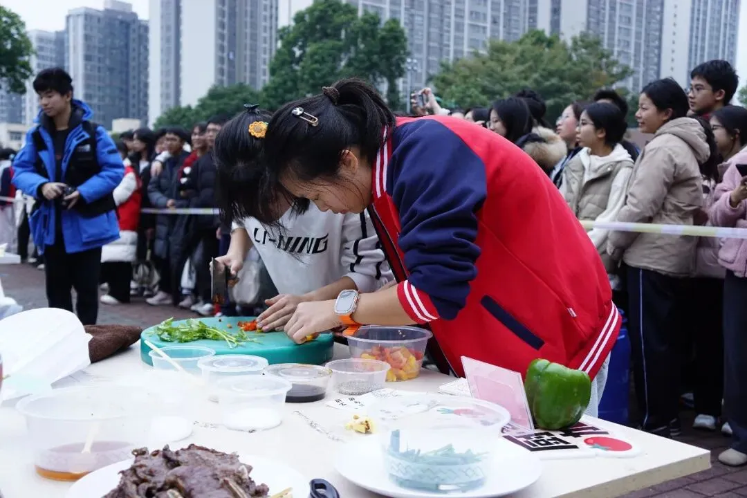随着主持人宣布厨艺大赛正式开始,在场的各个参赛队伍迅速投入“战斗”状态。小组成员合理分工,默契配合,齐心协力,大显身手,煎、炒、烹、炸、煮、切……大胆创新工艺与口味,十八般武艺令人眼花缭乱,惊喜不断。学生们瞬间化身为“校园厨神”,在方寸灶台间展厨艺、显创意,用舌尖美味解锁劳动教育新体验,让中华饮食文化在校园烟火中代代相传。