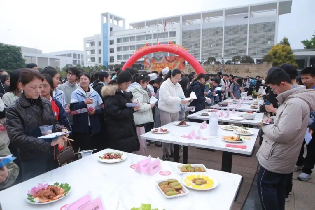 烹饪时间结束,各小组陆续将精心烹制的成品端至菜品展示区。瞬间,五颜六色的菜品整齐陈列,香气弥漫整个校园:金黄酥脆的炸物、色泽鲜亮的炒菜、造型别致的拼盘、汤汁浓郁的炖品,每一道都兼具“色、香、味、形、意”,让人目不暇接、垂涎欲滴。