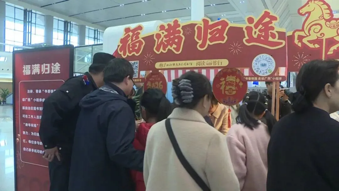 上午9时,南宁东站候车大厅内水墨飘香、糖画晶莹,一幅幅写满祝福的春联和“福”字赠予南来北往的旅客。