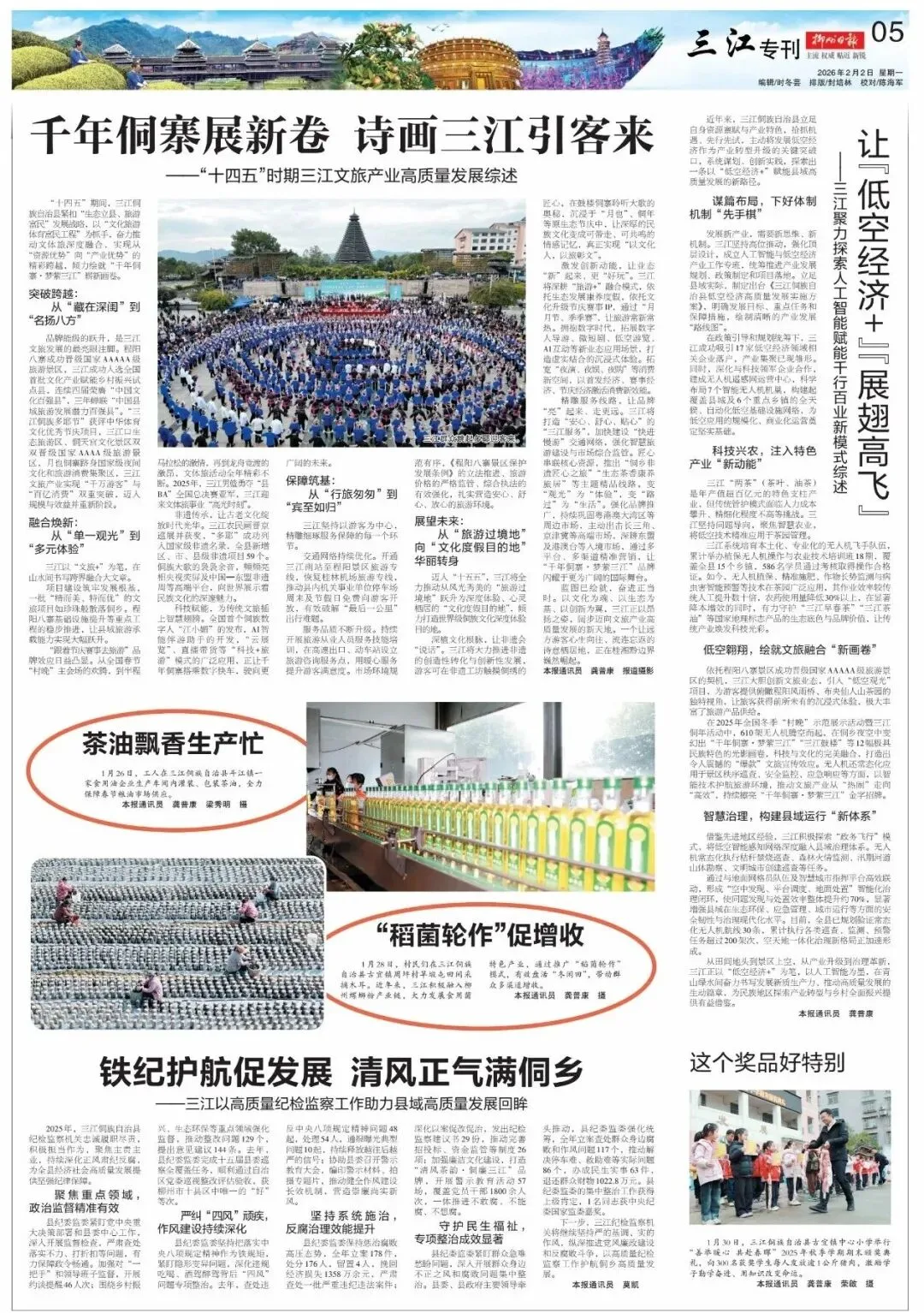 从田间地头到景区上空,从产业升级到治理革新,三江正以“低空经济+”为笔,以人工智能为墨,在青山绿水间奋力书写发展新质生产力、推动高质量发展的生动篇章,为民族地区探索产业转型与乡村全面振兴提供有益借鉴。
