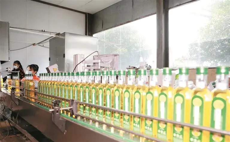1月26日,工人在三江侗族自治县斗江镇一家食用油企业生产车间内灌装、包装茶油,全力保障春节粮油市场供应。