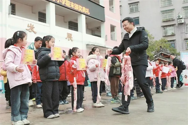 1月30日,三江侗族自治县古宜镇中心小学举行“善举暖心 共赴春晖”2025年秋季学期期末颁奖典礼,向300名获奖学生每人发放逾1公斤猪肉,激励学子勤学奋进、用知识改变命运。