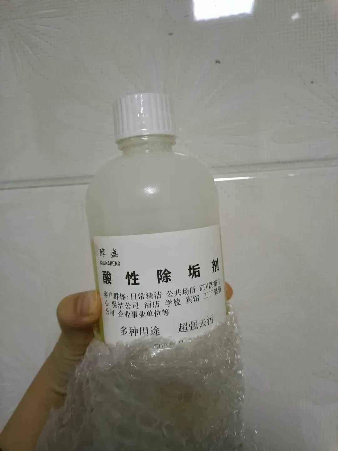 于是拿出来试了试,我还怕有腐蚀性,因为是拿塑料包好的,倒了几下后,再刷,容易的多,黑色污垢慢慢化开成浑浊的水,我搞了两次,搞得差不多了,蹲坑全白的只剩几点黑没弄出来。