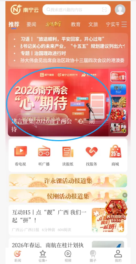 进入客户端首页,轮播导航栏的【建言征集|2026南宁两会“心”期待】页面,即可进入征集活动板块。