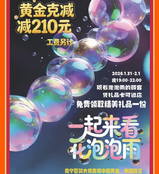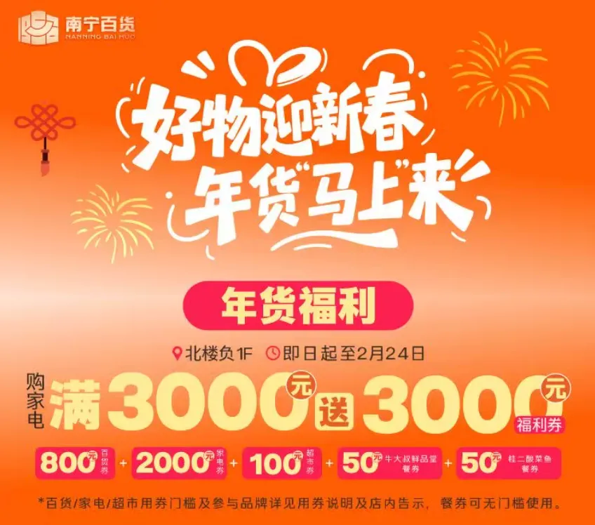 即日起至2月24日,南宁百货新春市集开启,设非遗互动、潮玩打卡、广西特色年货等大区域,能买能逛能玩,同步还有家电满赠、黄金克减等优惠,年味拉满!