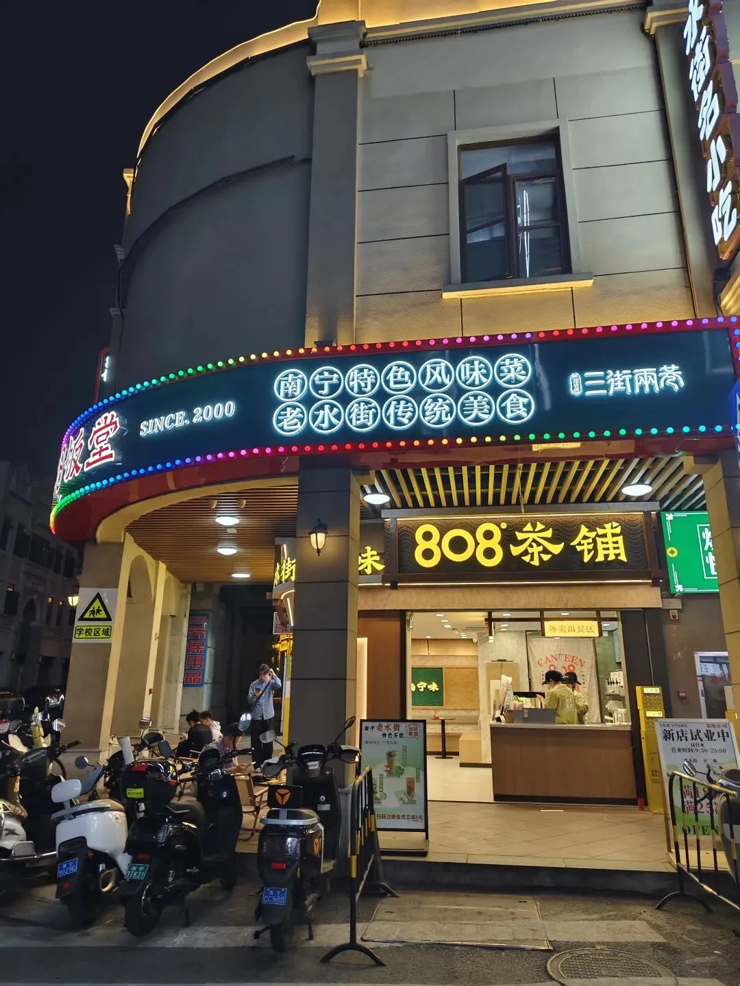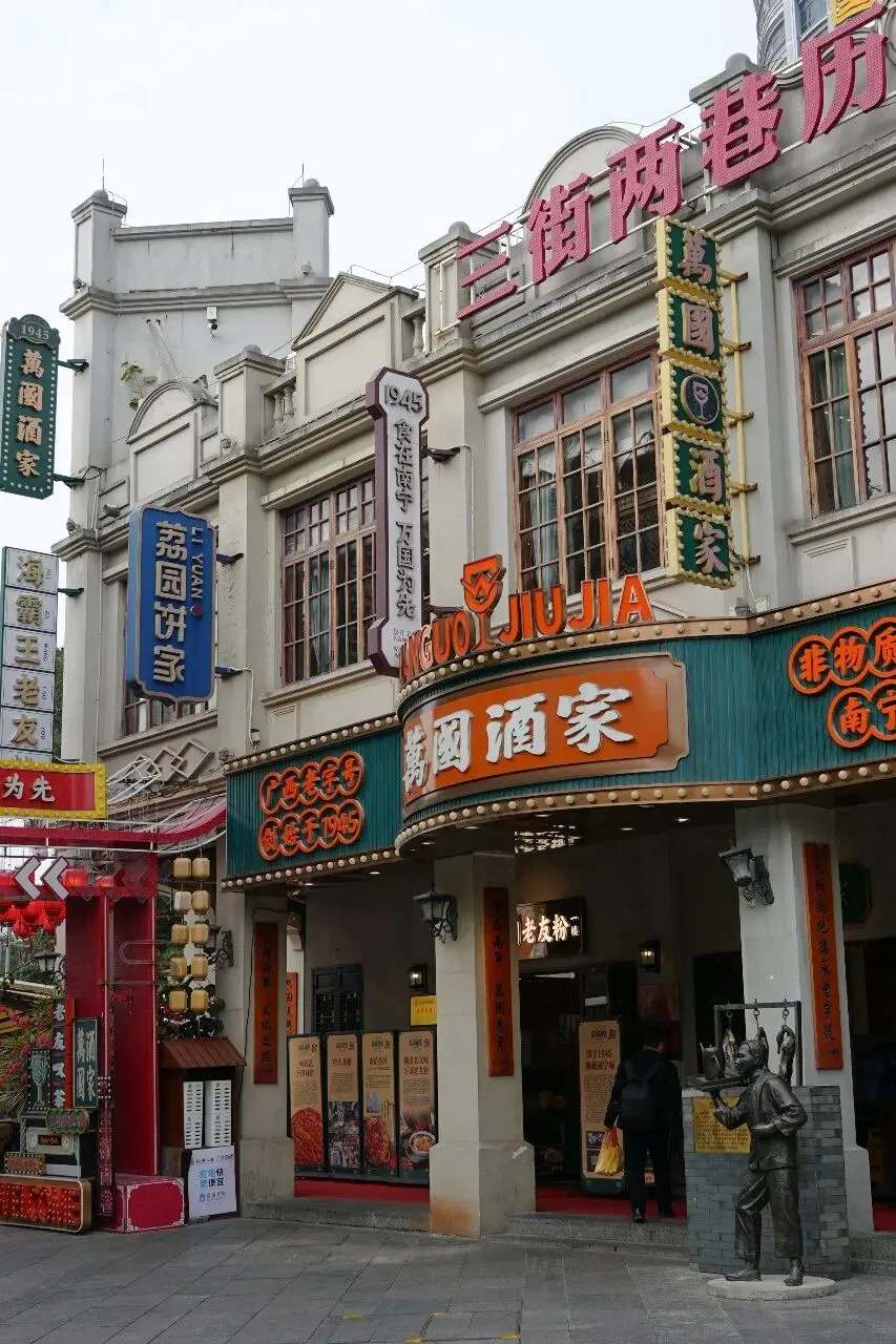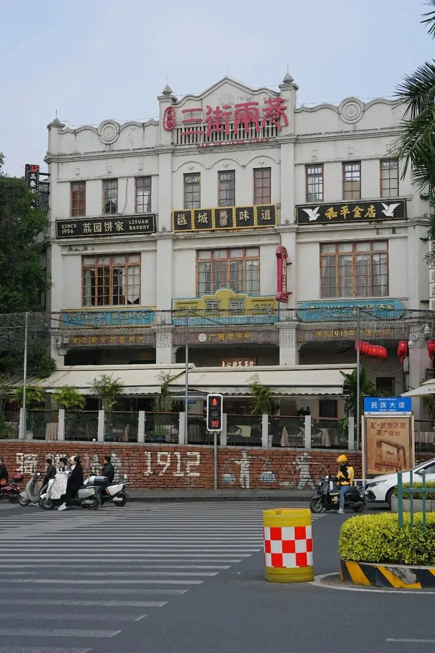 食丰富多样,老字号与新派风味并存。万国酒家始创于1945年,是百年邕菜代表,老友粉汤底醇厚,早午茶点如虾饺皇、脆皮鲜虾红米脆肠、粉饺、糖水都值得一试;新八桂油茶铺的恭城油茶是非遗特色,搭配阳朔啤酒鱼,香辣开胃;复记老友粉以酸笋和豆豉为特色,酸辣鲜香;荔园饼家的现烤鸡仔饼香气四溢,亚热带水果酸嘢……