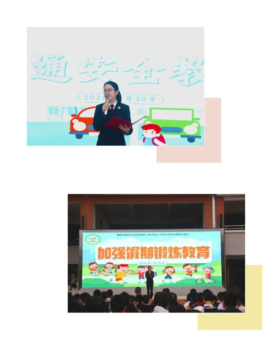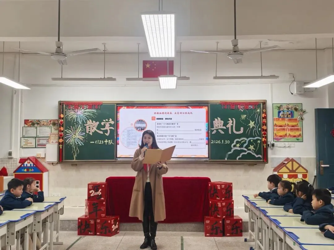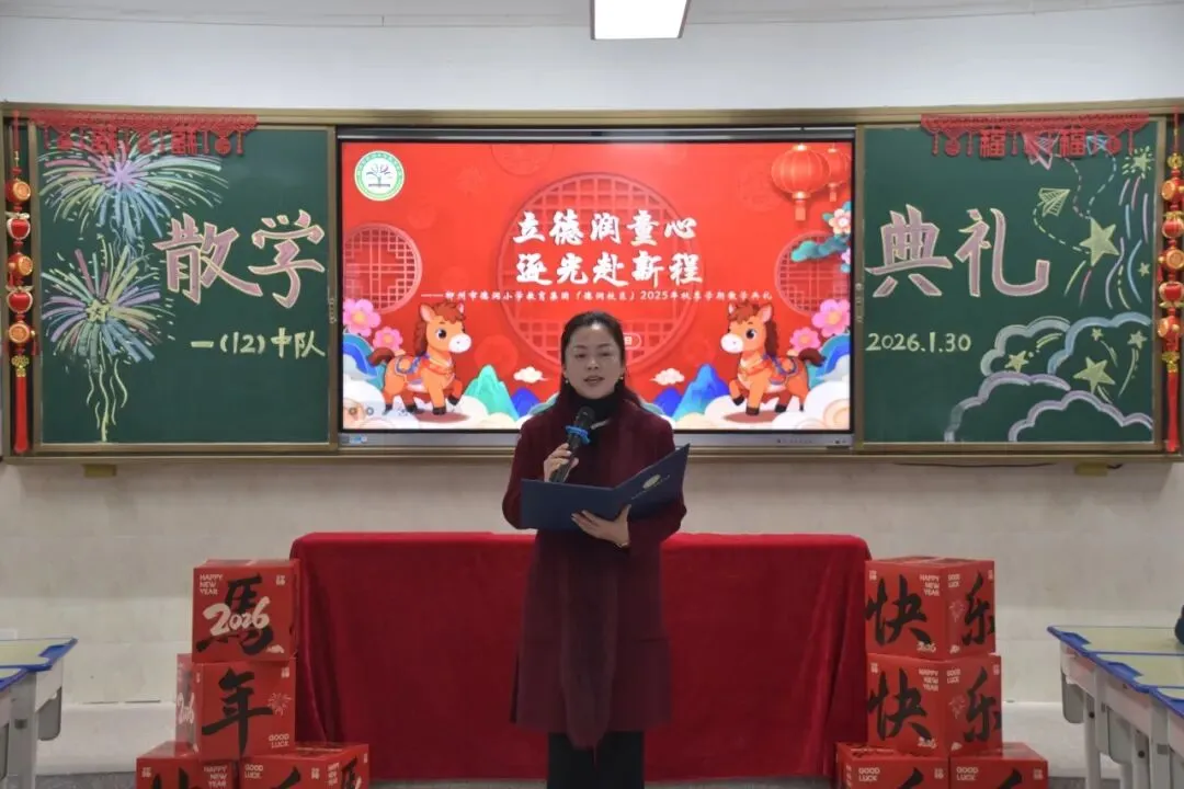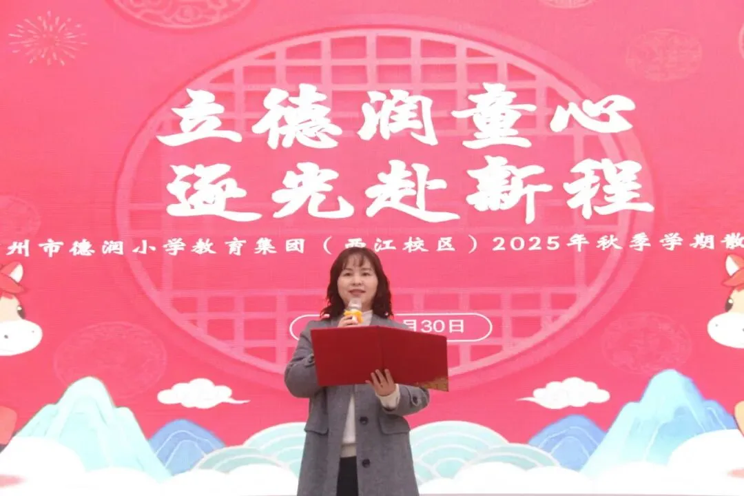 典礼伊始,德润小学教育集团总校长黄莉棋和西江校区执行校长袁雪莉,分别为两校区的全体师生送上马年最温暖的祝福。她们以“马到成功”“一马当先”“策马扬鞭”寄寓殷切期许,叮嘱孩子们:假期是沉淀自我的好时光,要合理规划、勇担责任,更要怀揣对家国的热爱,让每一天都闪闪发光。这些话,如同为孩子们的梦想插上翅膀,照亮了前行的方向。
