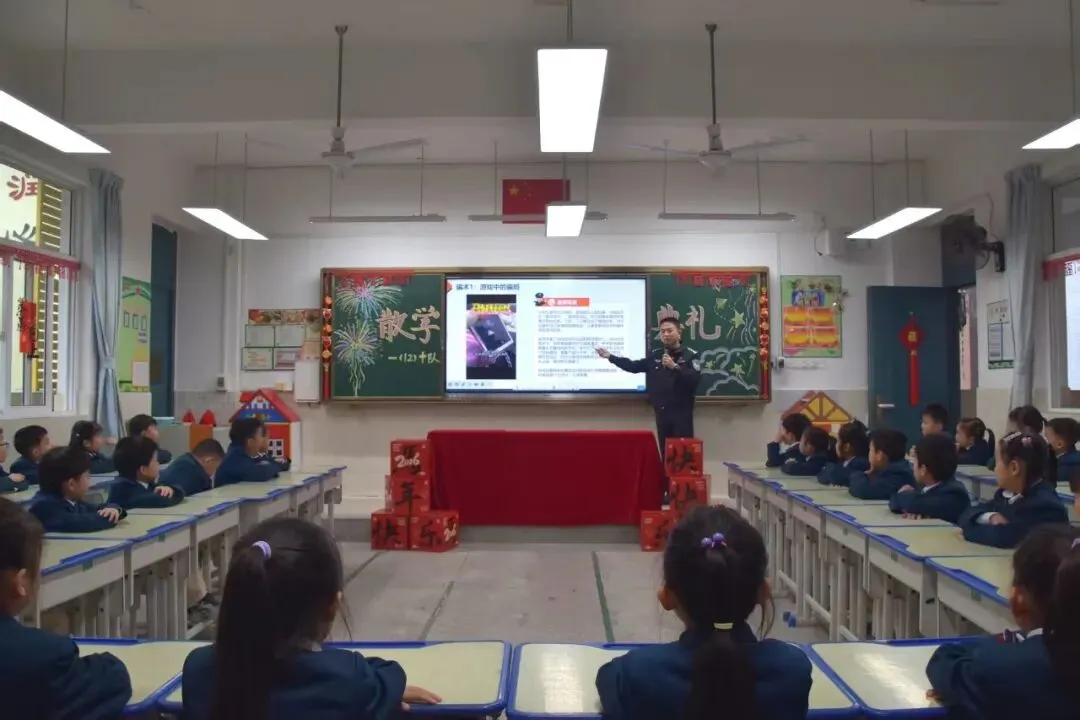 德润校区邀请到了柳州市公安局刑侦支队副队长张健期警官,他带来的防诈骗讲座,宛如一场“头脑特工队”的实战训练;西江校区则邀请到鱼峰区检察院陈珊珊检察官亲授寒假安全课,从防范一氧化碳到预防传染病,知识点满满。而最“燃”的环节,莫过于西江校区的安全小剧场!莫承鑫老师和同学们将“电话手表诈骗”、“游戏福利陷阱”搬上舞台,夸张又真实的表演,引得全场掌声与笑声此起彼伏。原来,学会保护自己,可以这么有趣、这么酷!
