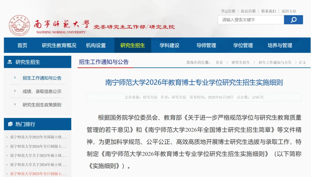 根据国务院学位委员会、教育部《关于进一步严格规范学位与研究生教育质量管理的若干意见》和《南宁师范大学2026年全国博士研究生招生简章》等文件精神,为更加科学规范、公平公正、高效高质地开展博士研究生选拔与录取工作,特制定《南宁师范大学2026年教育博士专业学位研究生招生实施细则》(以下简称《实施细则》)。