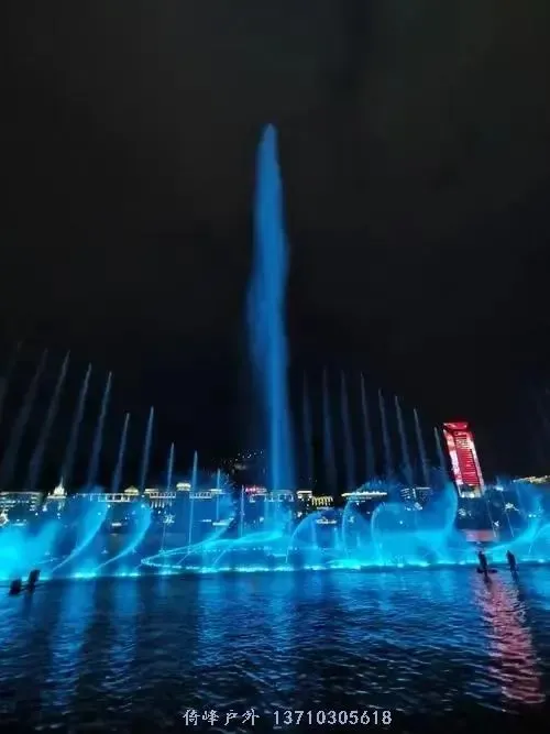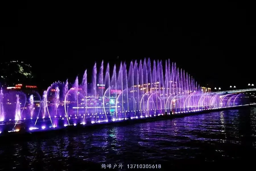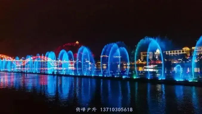 该喷泉采用三维数码万向旋转技术、数控气爆技术,大功率高亮度水下LED灯、多位一体综合表演技术,是目前世界上江面最大升降浮式喷泉。