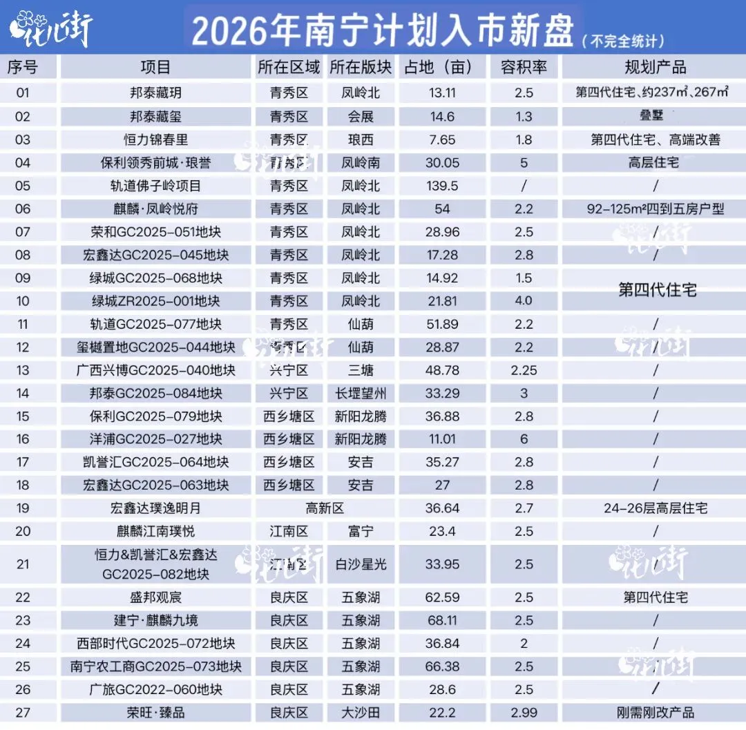 不完全统计,南宁2026年新盘数27个,很大一部分可能在上半年面市。
