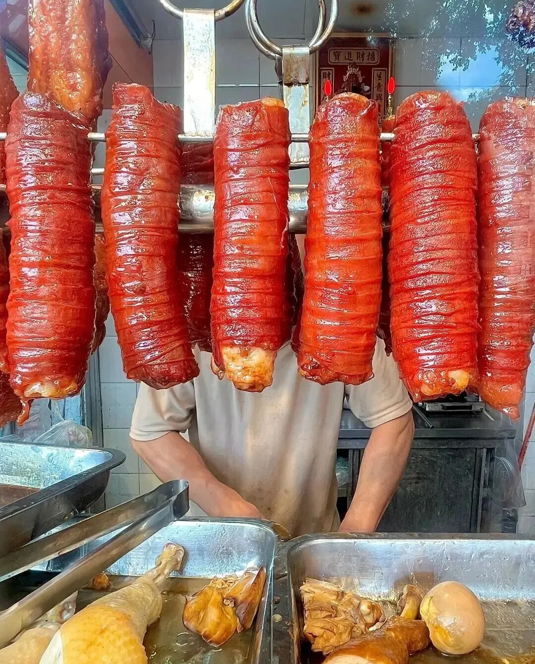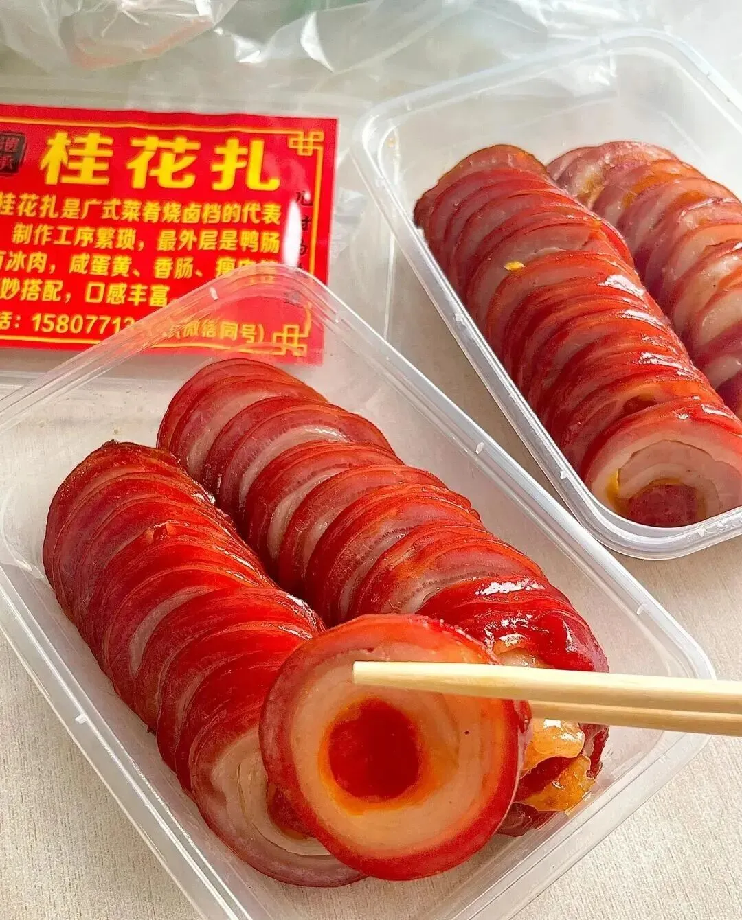 你们看 , 中间是咸蛋黄 , 咸蛋黄里面还包着一根腊肠 , 外面裹的应该是肉皮或者什么东西 , 层层叠叠的 , 做法肯定很费功夫。