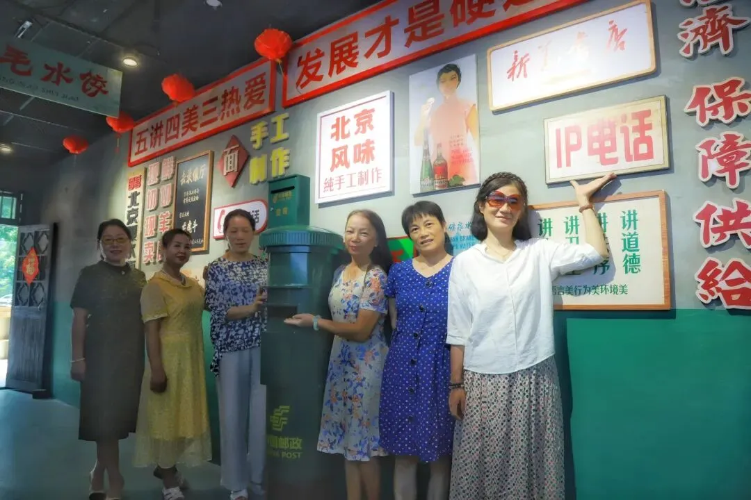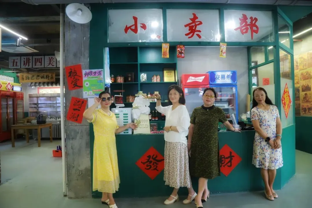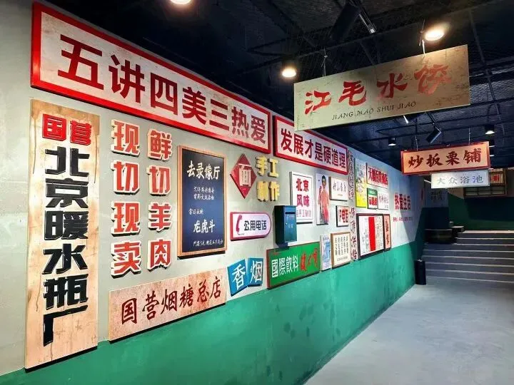 复古风拉满的小卖部角落,木质货柜仿佛带着岁月包浆,我们仿佛看到上面摆着印着牡丹图案的搪瓷缸、铁皮暖壶,还有老式手电筒、橡皮筋、跳棋……配上墙上 “小卖部” 三个字,烟火气里全是八十年代的质朴与热闹。