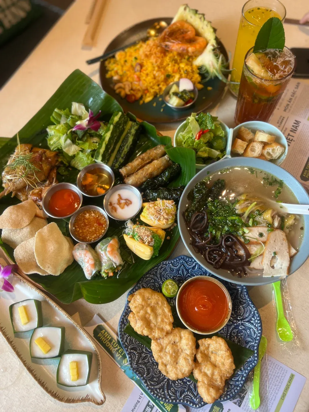当地名菜是越南春卷。简单,却有讲究。米纸泡软,卷上粉丝、虾仁、香草,再轻轻一裹,下锅炸至浅金。外壳脆得像薄冰,一口咬开,蒸汽混着香气往外冒。不是丰盛的宴,而是家常的温柔。