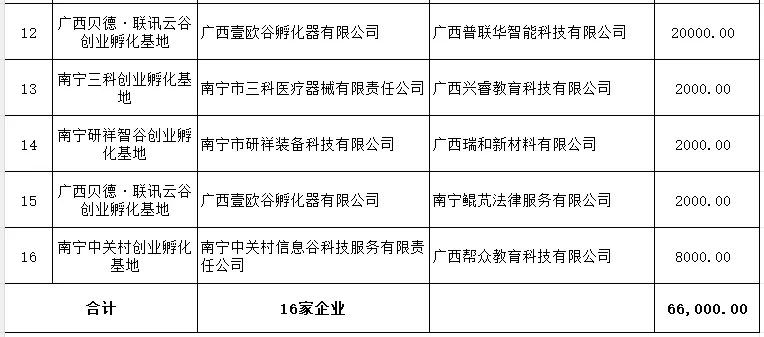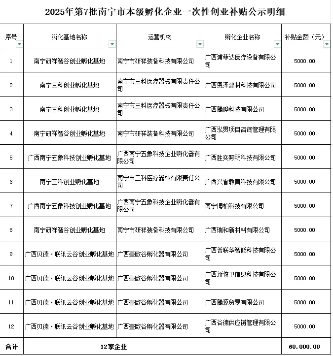 根据《广西壮族自治区人力资源和社会保障厅 广西壮族自治区财政厅关于进一步加强创业孵化基地建设和扶持工作的通知》(桂人社规〔2021〕5号)文件规定,拟发放我市2025年第7批南宁市本级孵化企业补贴合计金额:壹拾贰万陆仟元整(¥126,000.00),其中孵化企业一次性创业补贴12家,小计金额:陆万元整(¥60,000.00);孵化企业新吸纳一次性带动就业补贴16家,小计金额:陆万陆仟元整(¥66,000.00)。现将拟发放补贴的单位名单公示,公示时间为5个工作日。