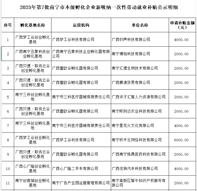 南宁市劳动就业服务管理中心公示2025年第7批市本级孵化企业补贴名单