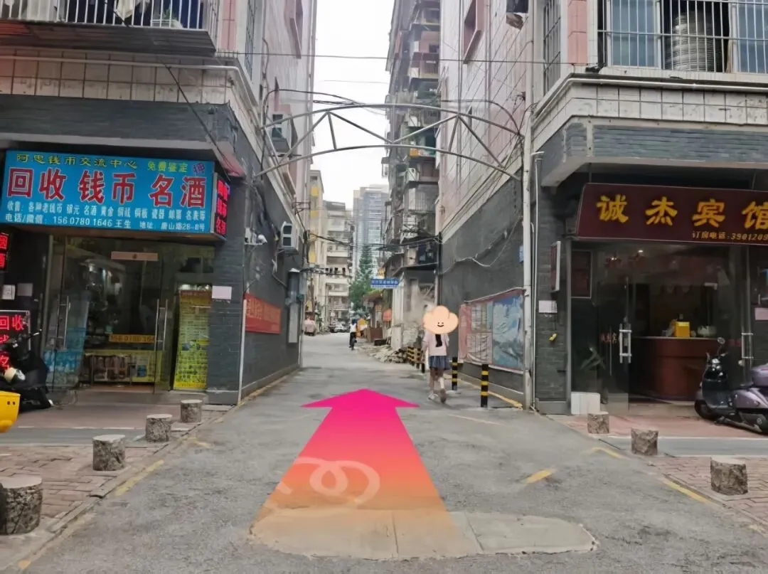 地图直接导航到鸳鸯楼,就可以看到诚杰宾馆,然后往旁边的小巷子直走,走到收废旧店这个地方就可以左拐,然后直走就到了。