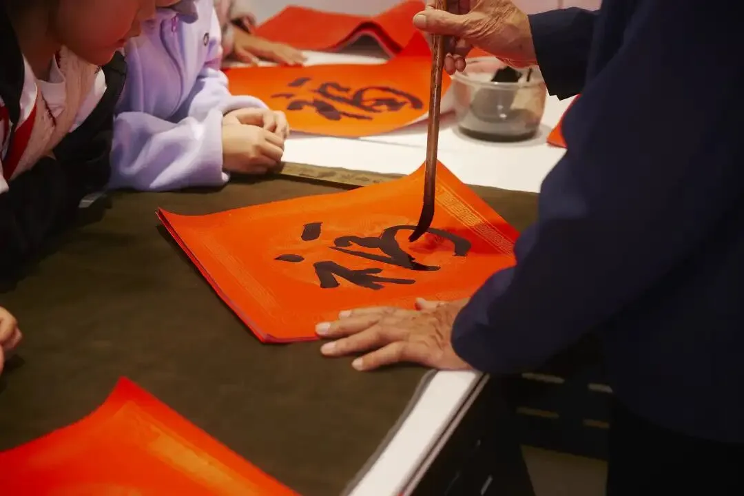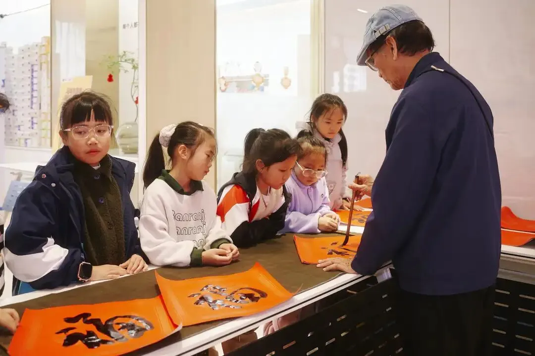 现场特别邀请的民间书法大师陈伯宁挥毫泼墨,现场展示对联书写技艺。苍劲有力的笔触间,“福”字与吉祥对联跃然纸上,孩子们屏息凝神围观,在墨香中感受中华传统文化的深厚魅力。