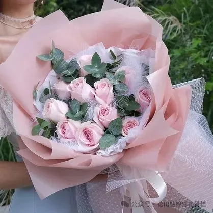 材料:11支精品粉雪山玫瑰,搭配适量尤加利羽毛。