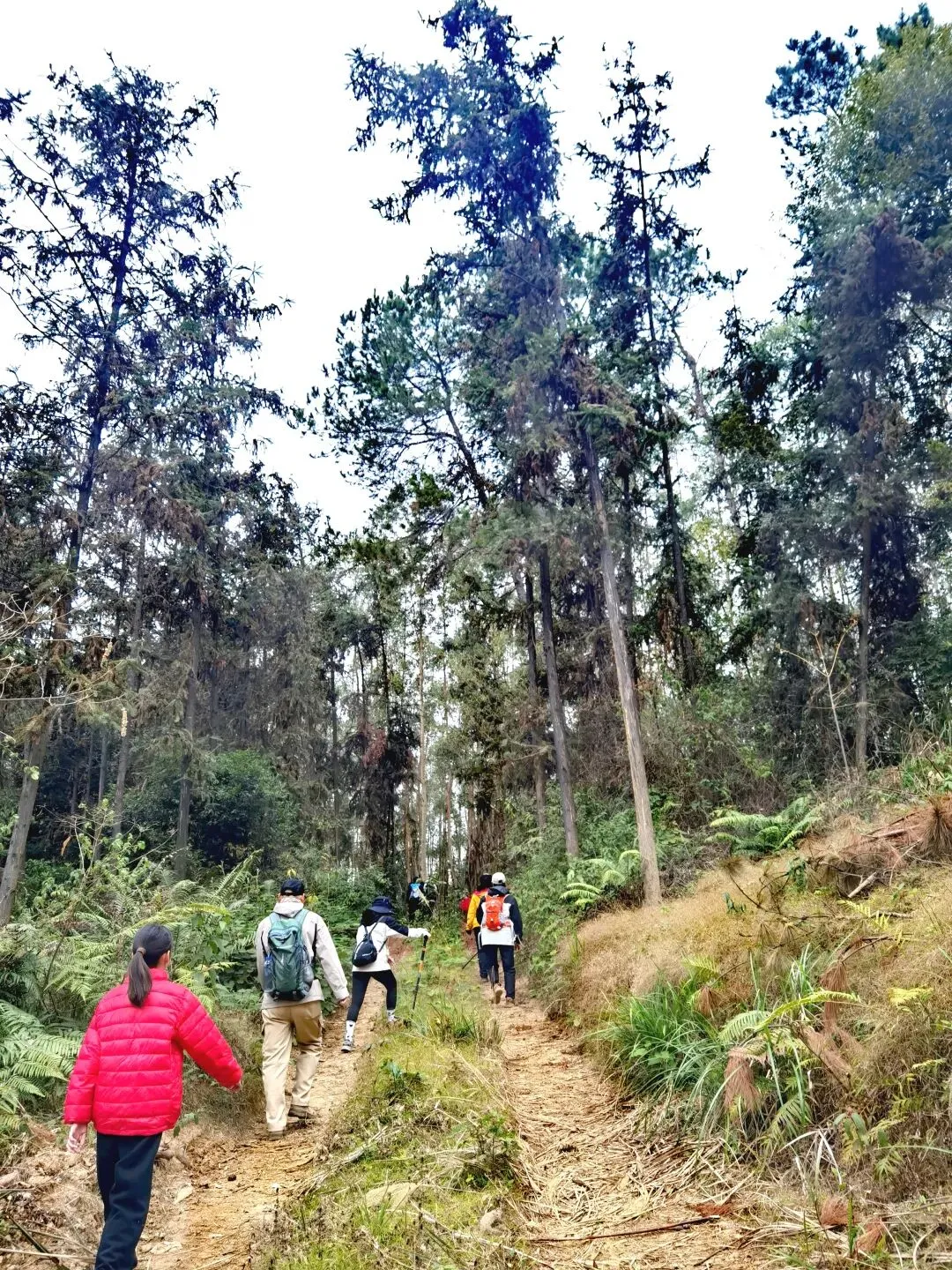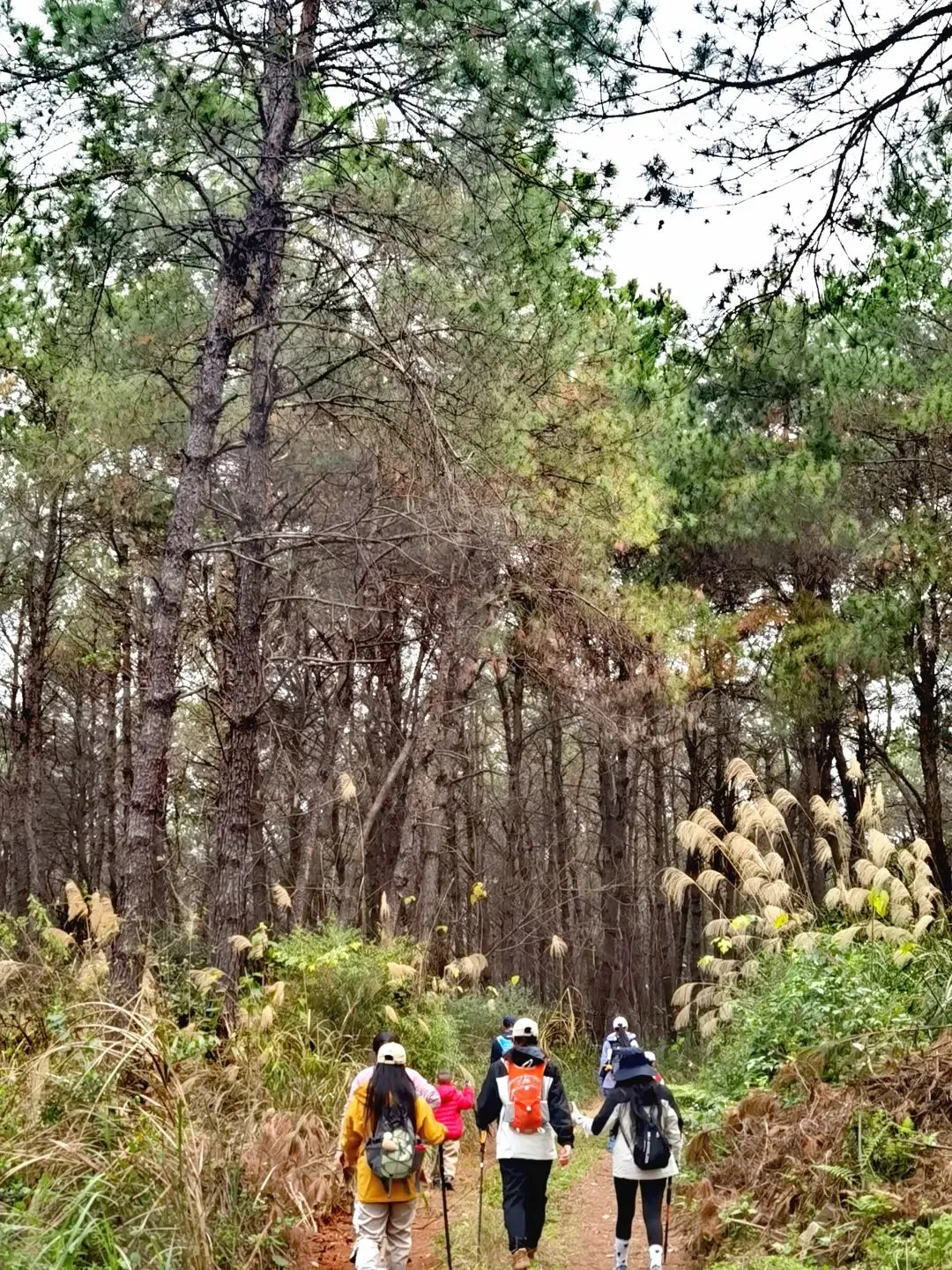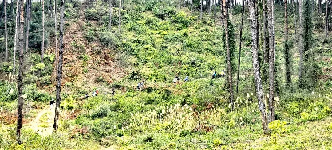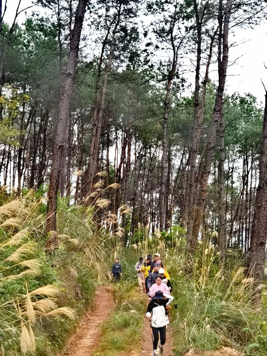 穿过桉树林,路线转入山地松林路段,缓坡与草丛小径交替,视野逐渐开阔,站在坡顶能俯瞰远处连绵的山林。