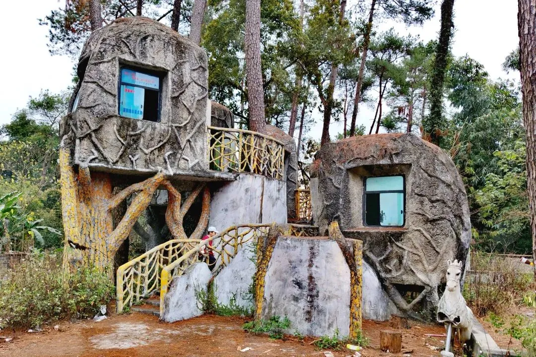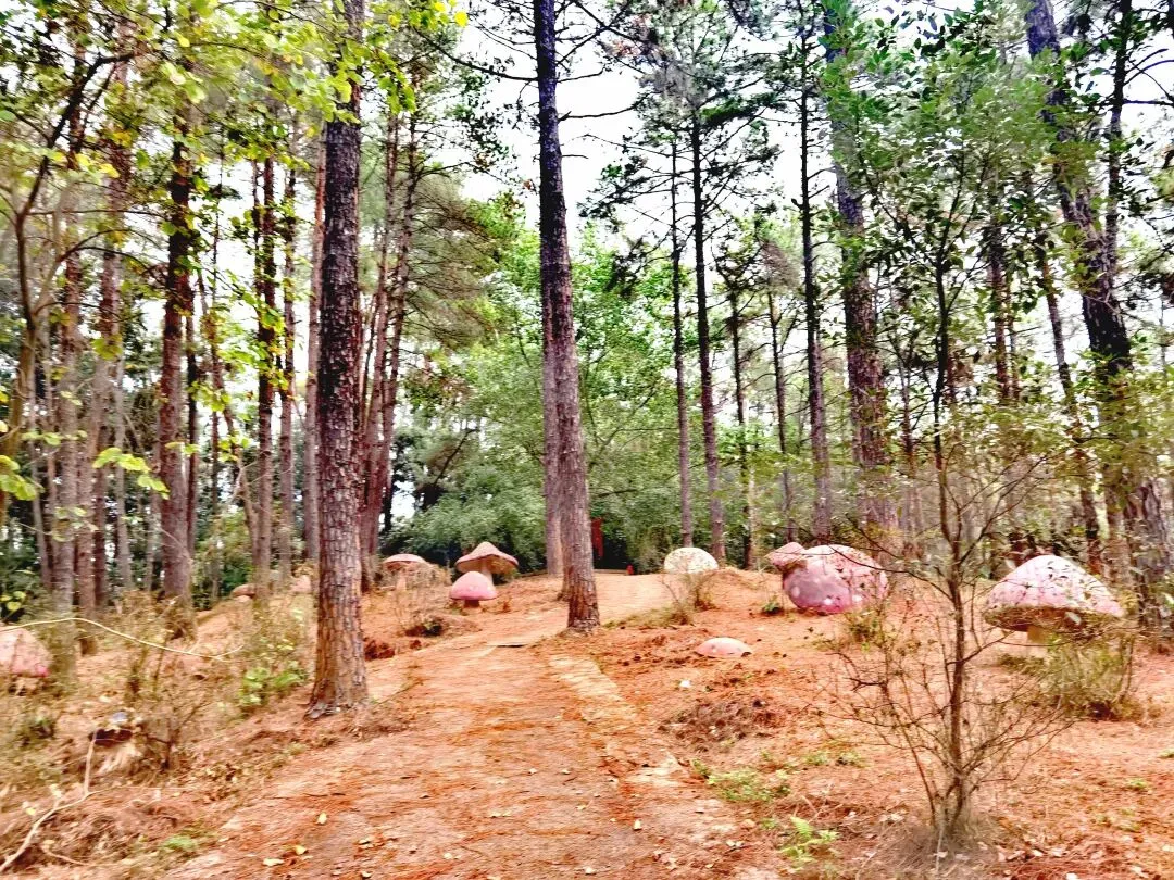 刚走没多久,一片荒废的小乐园就撞进视野——巨型蘑菇雕塑、石头砌成的小木屋、迷你城堡,还有一座缩小版埃菲尔铁塔,复古又童趣的装置藏在绿意间,仿佛闯入被时光遗忘的童话镇。