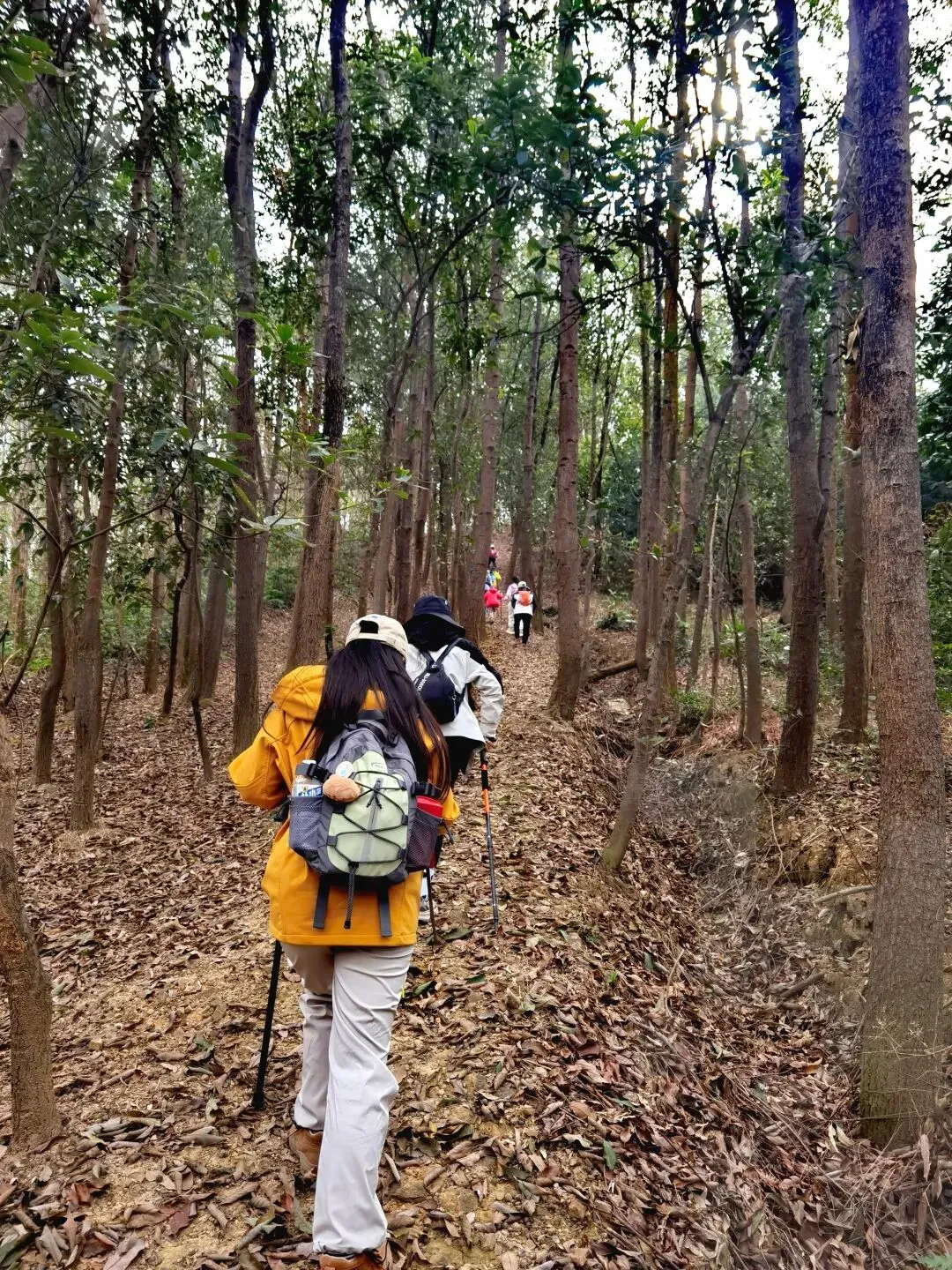 告别小乐园,真正的“徒步爽感”正式上线。脚下是干净的松针地毯,柔软得像踩在云朵上,有队员忍不住感叹:“就爱走这种路!随便走十几公里都不费劲”。两旁的松树高大挺拔,笔直向上延伸,枝叶交错间漏下斑驳阳光,空气里满是松针的清冽香气,深吸一口,全是治愈身心的负氧离子,远离城市喧嚣的快乐瞬间拉满。