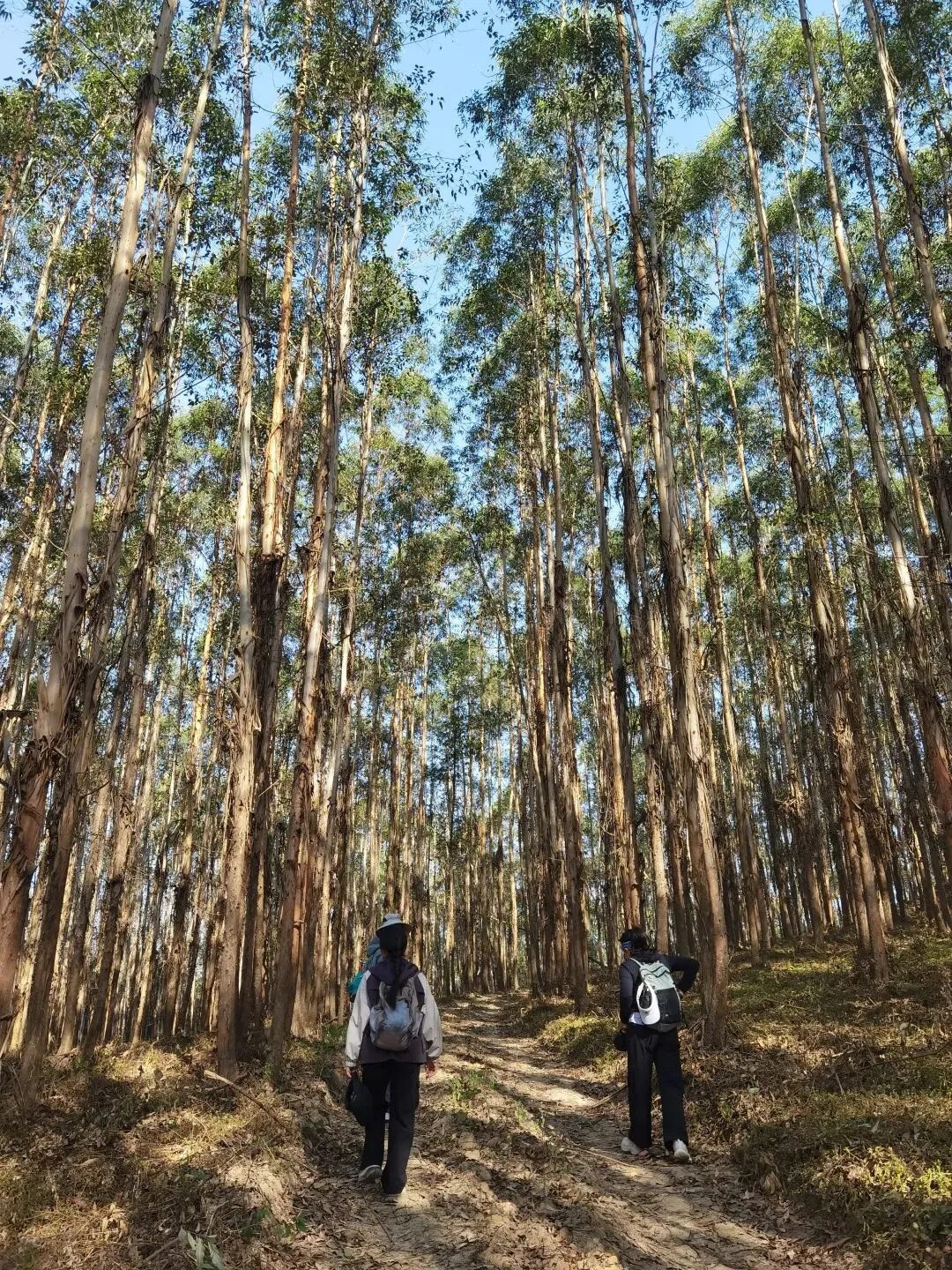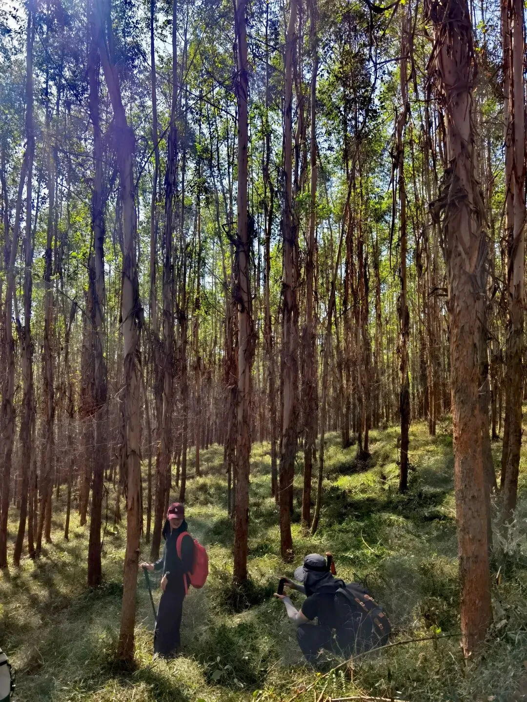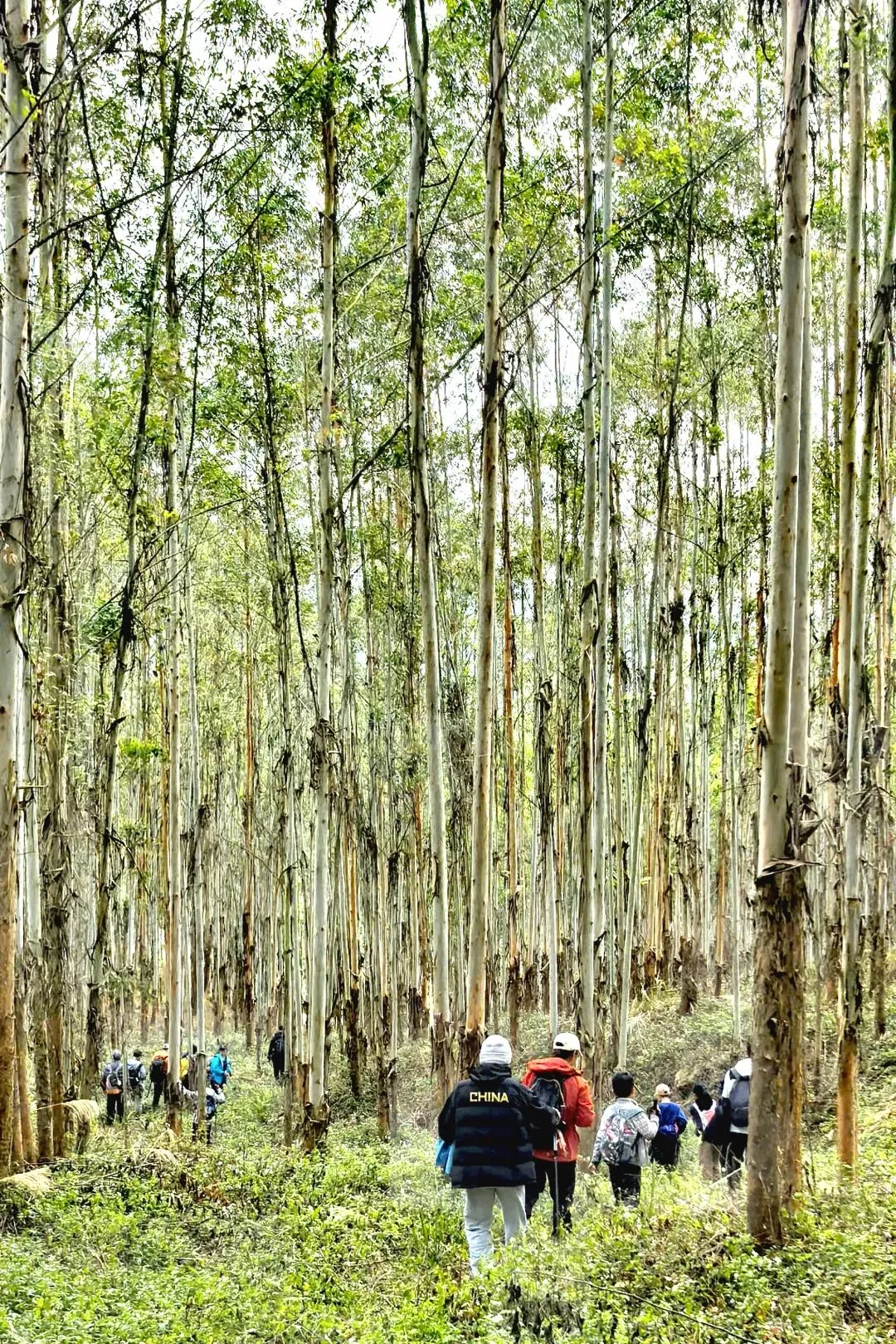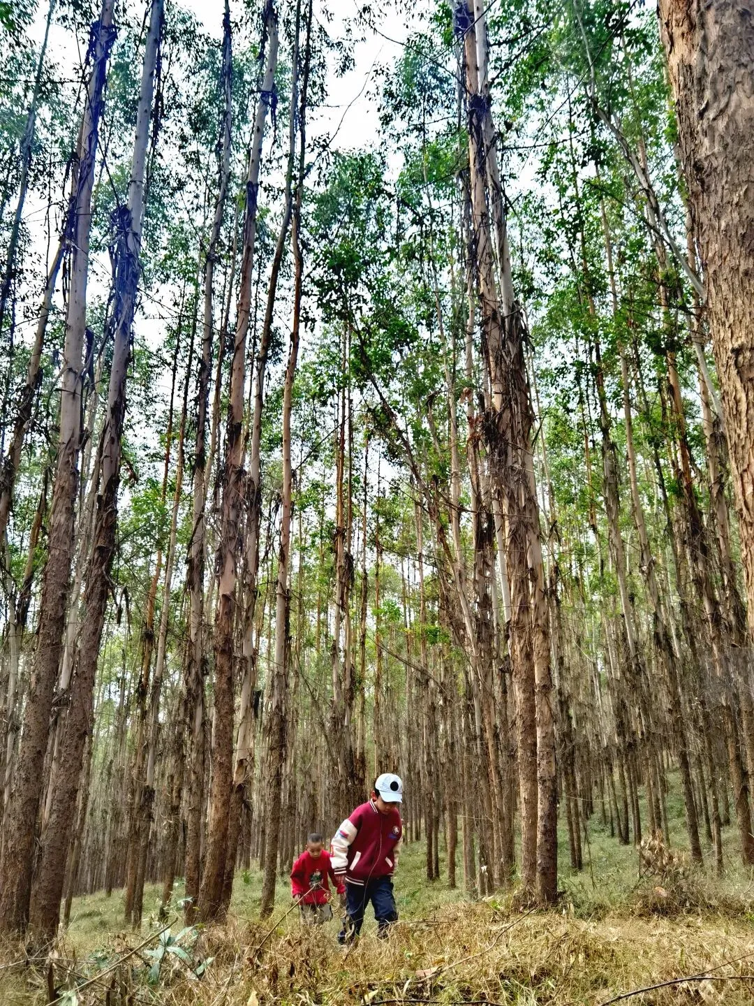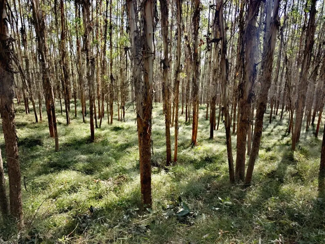 画风瞬间切换,一片桉树林猝不及防地出现,妥妥的“绿光森林”既视感!成片的桉树笔直矗立,树干光洁挺拔,林下是低矮细密的草丛,阳光透过枝叶筛下,在地面投下晃动的光斑,穿行其中,静谧又豁然,仿佛闯入电影里的秘境,连呼吸都变得轻柔。