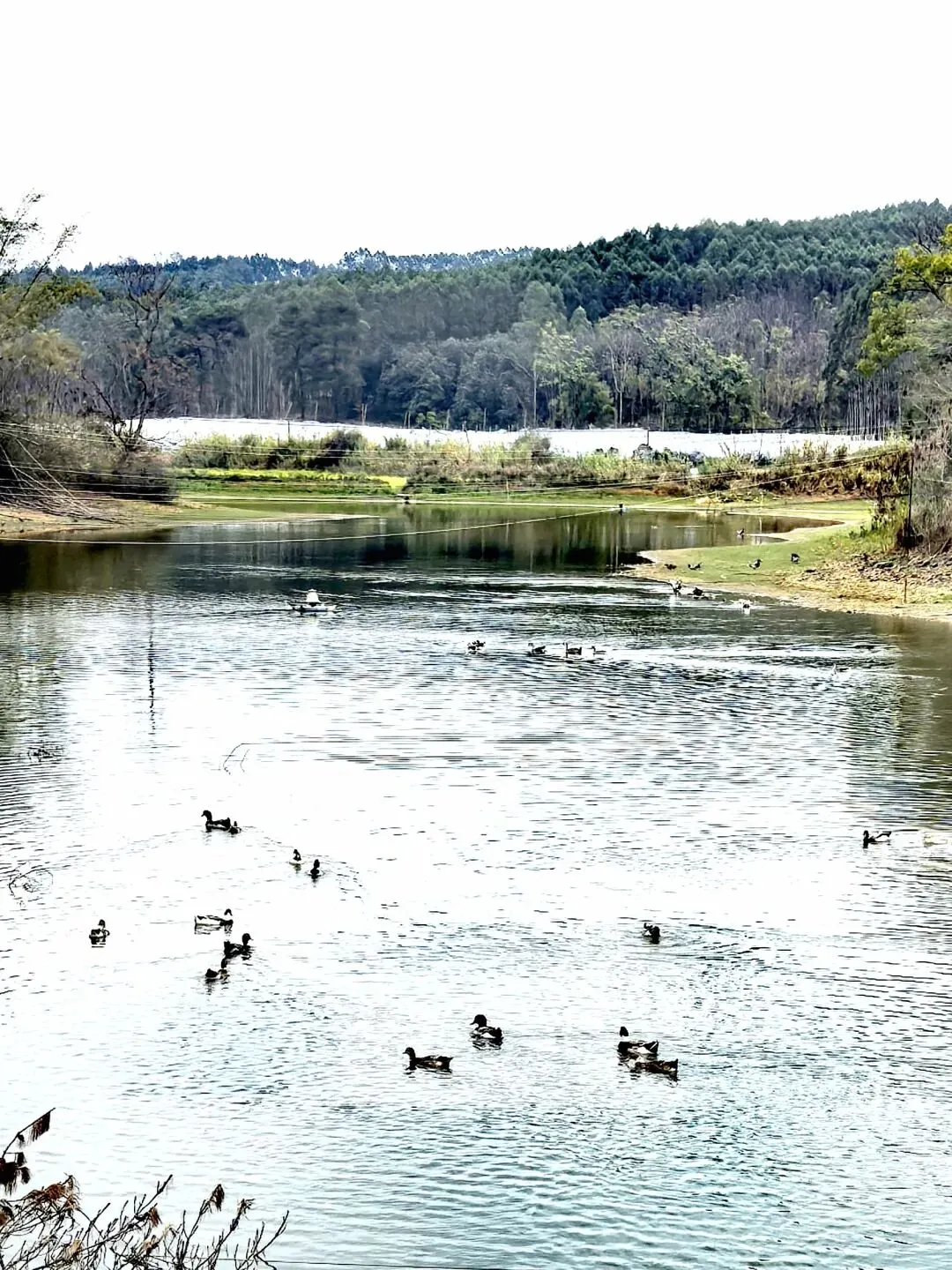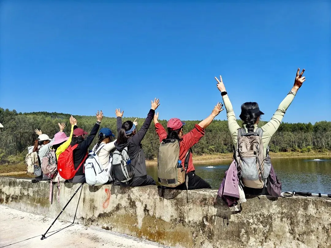 一路欢声笑语间,水库映入眼帘,澄澈的水面像一面镜子,倒映着两岸的翠绿树林,成群的鸭子在水面悠闲游弋,泛起阵阵涟漪。岸边的水泥平台视野绝佳,是合影留念的好地方,大家用相机定格下这趟旅途的圆满时刻,吹着山间微风,看着山水相依的美景,所有疲惫都烟消云散。